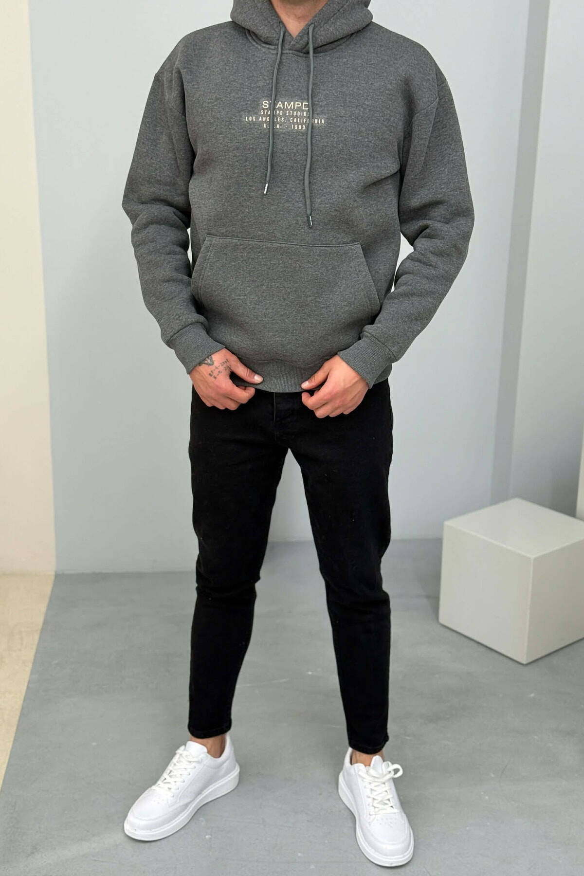 FLUFFY FRONT WRITTINGS MEN HOODIE DARK GREY/GEE