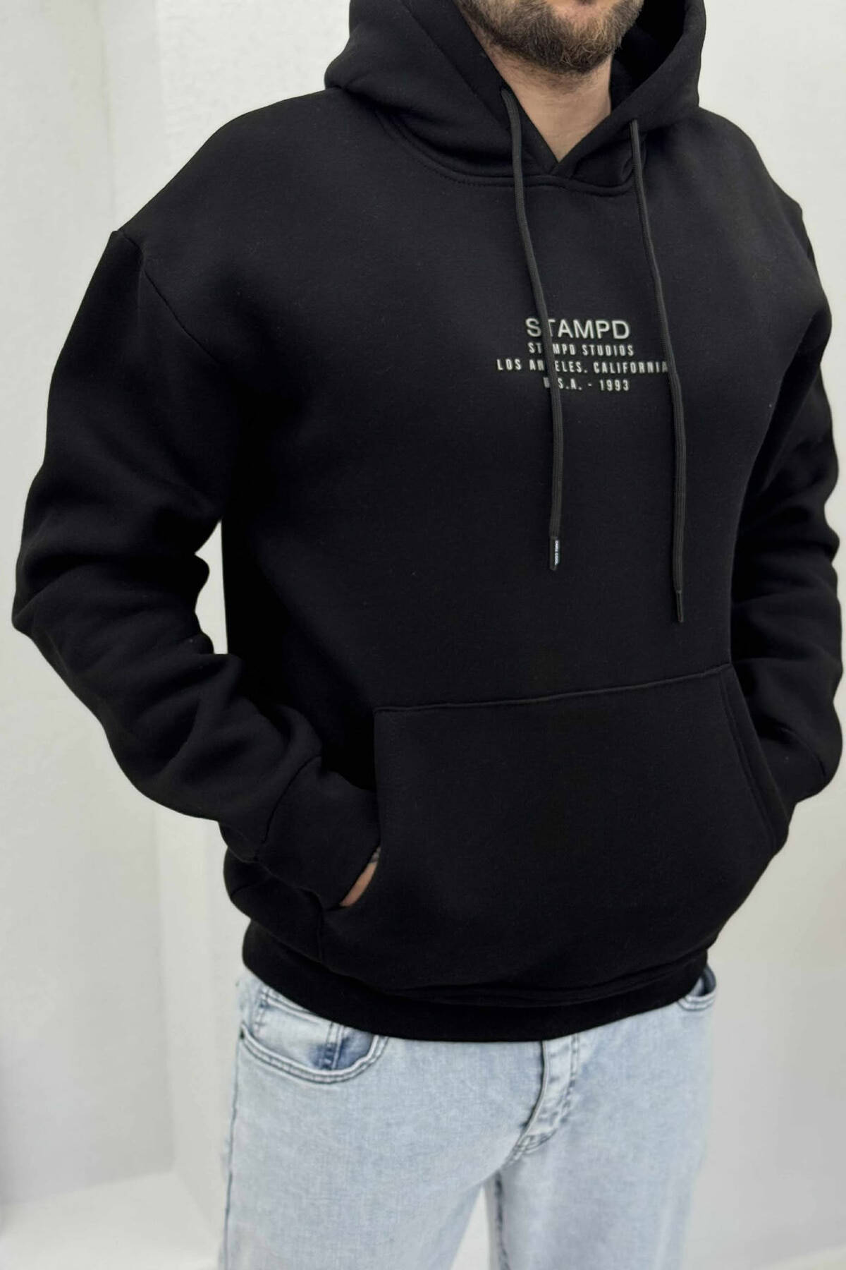 SMALL DETAIL ONE COLOR FLUFFY MEN HOODIE BLACK/ E ZEZE