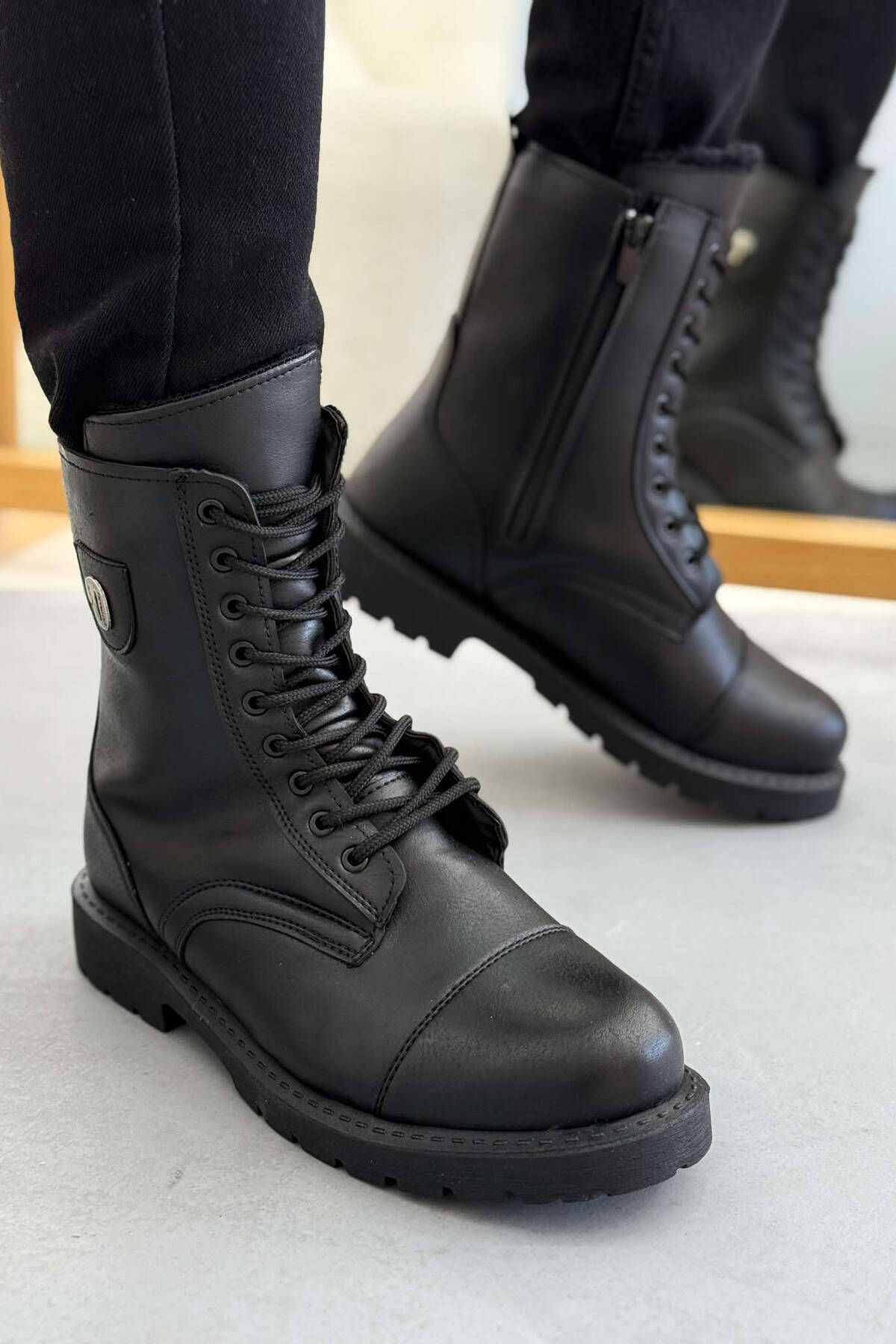 FLUFFY LACING LEATHER MEN ANKLE BOOTS BLACK/ E ZEZE