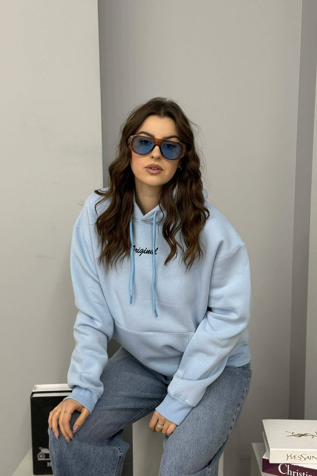 FLUFFY ONE COLOR SMALL FRONT WRITTING WOMEN HOODIE LIGHTBLUE/BZ