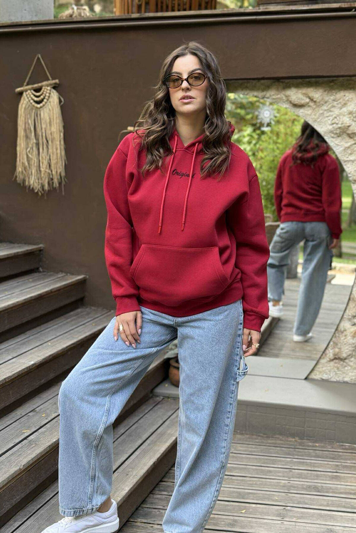 FLUFFY ONE COLOR SMALL FRONT WRITTING WOMEN HOODIE RED/E KUQE