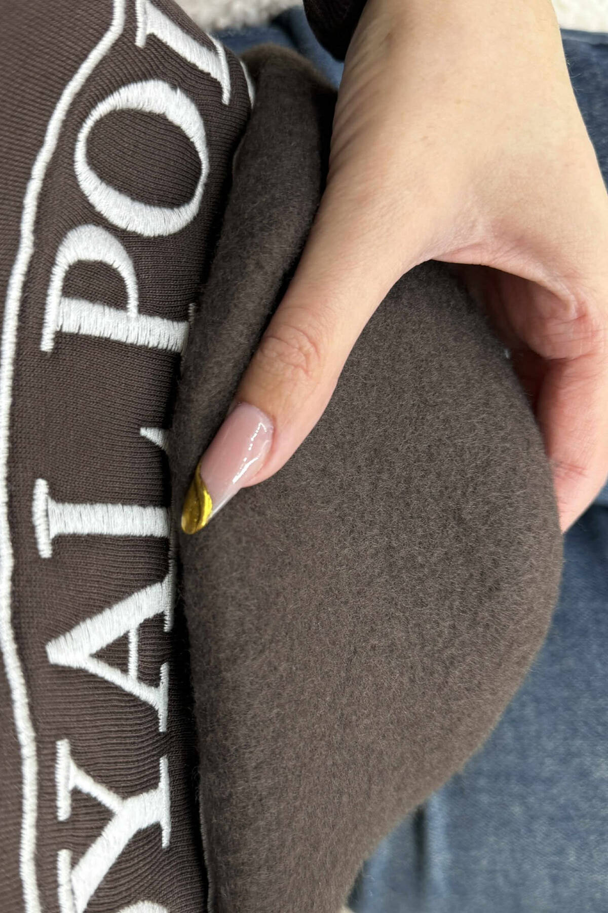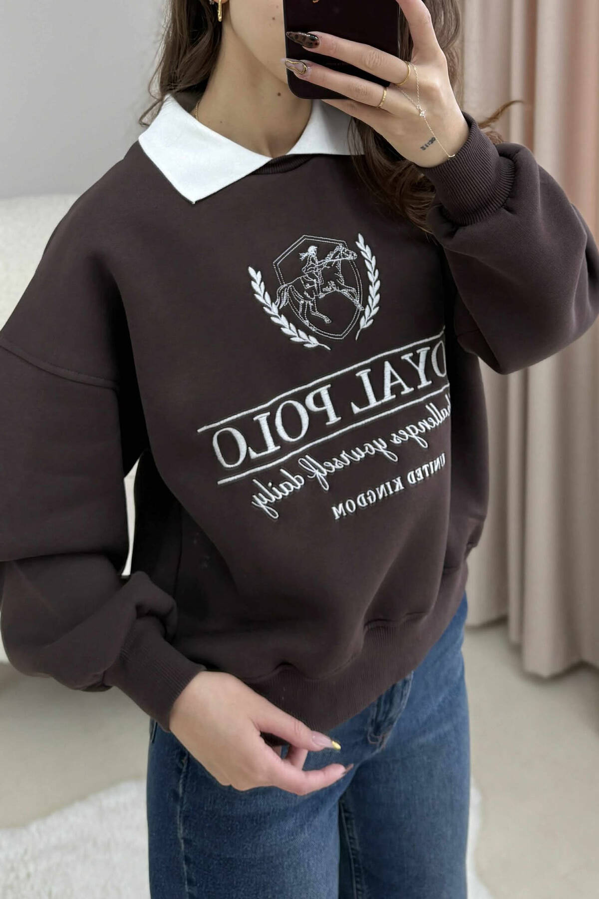 ONE COLOR FLUFFY POLO NECK WOMEN SWEATSHIRT BROWN/KAFE