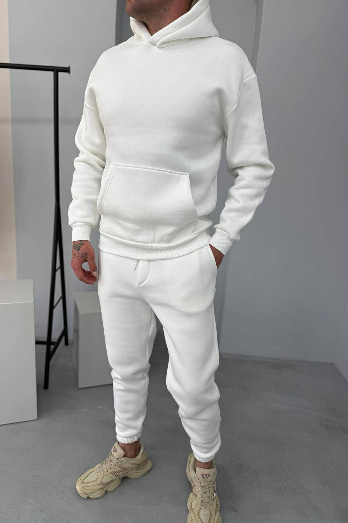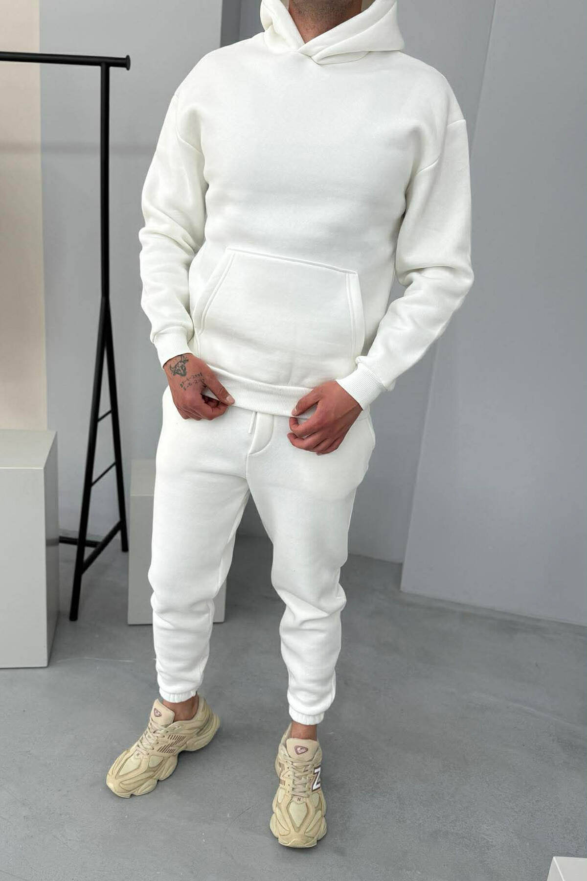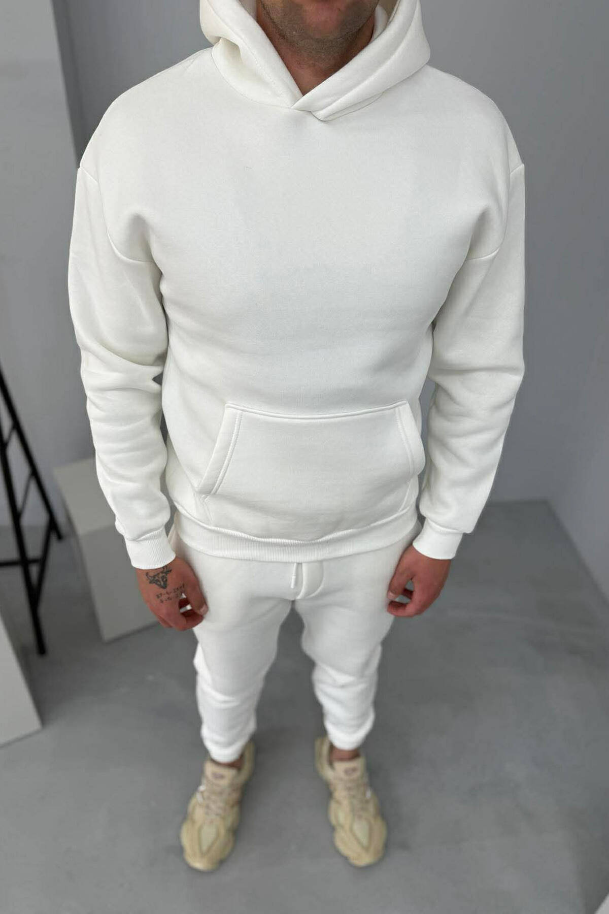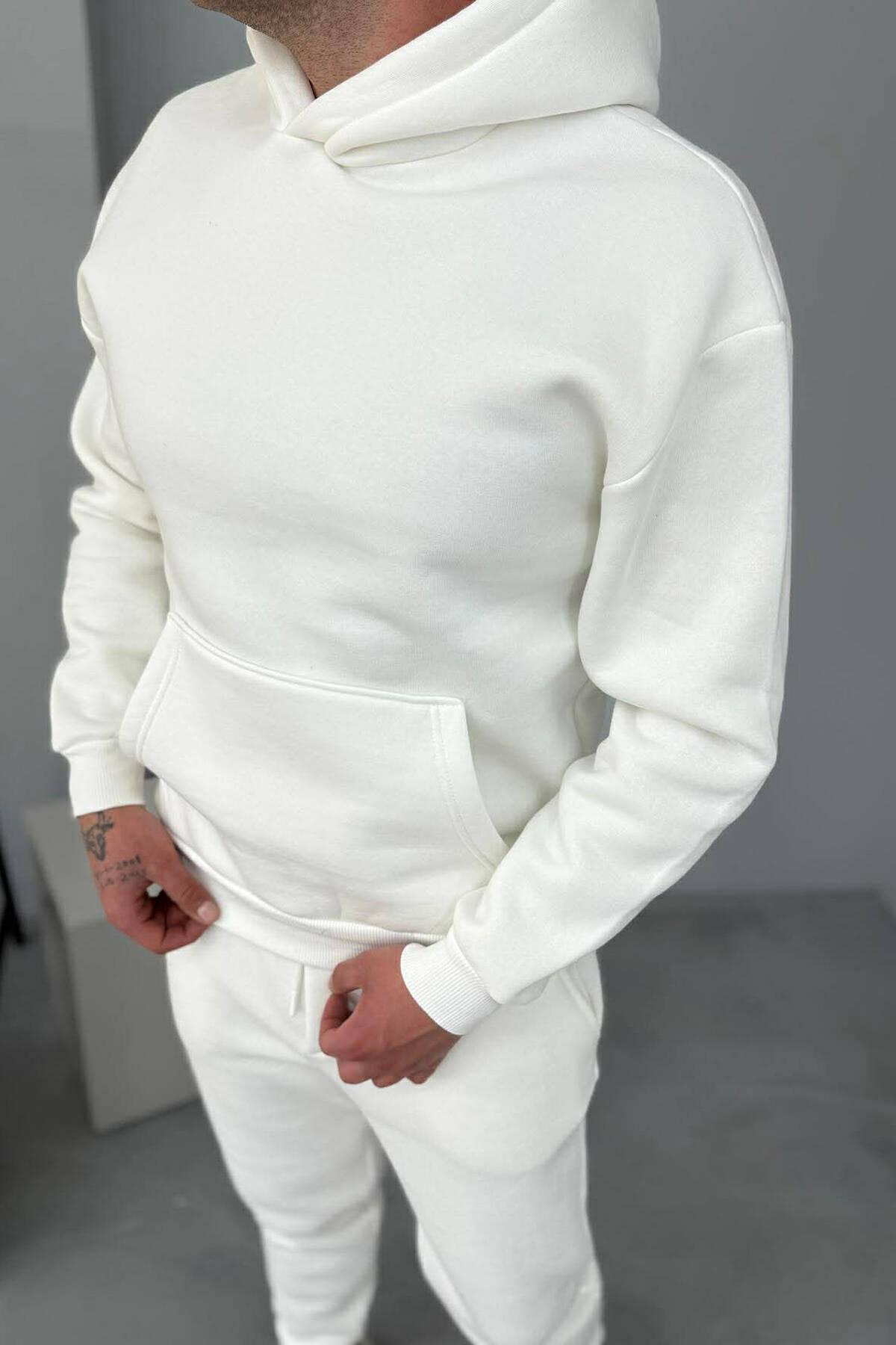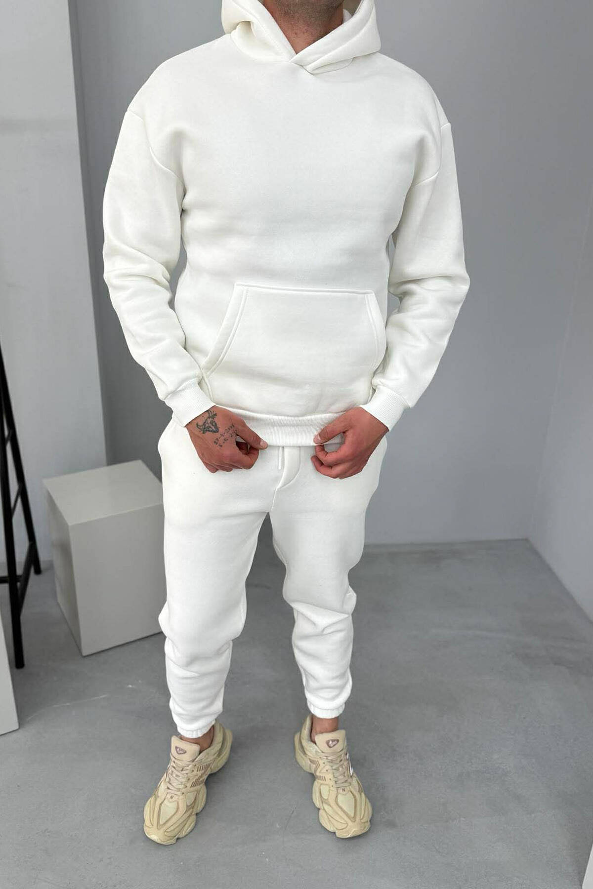 FLUFFY SIMPLE ONE COLOR HOODIE+JOGGER MEN SET WHITE-E BARDHE