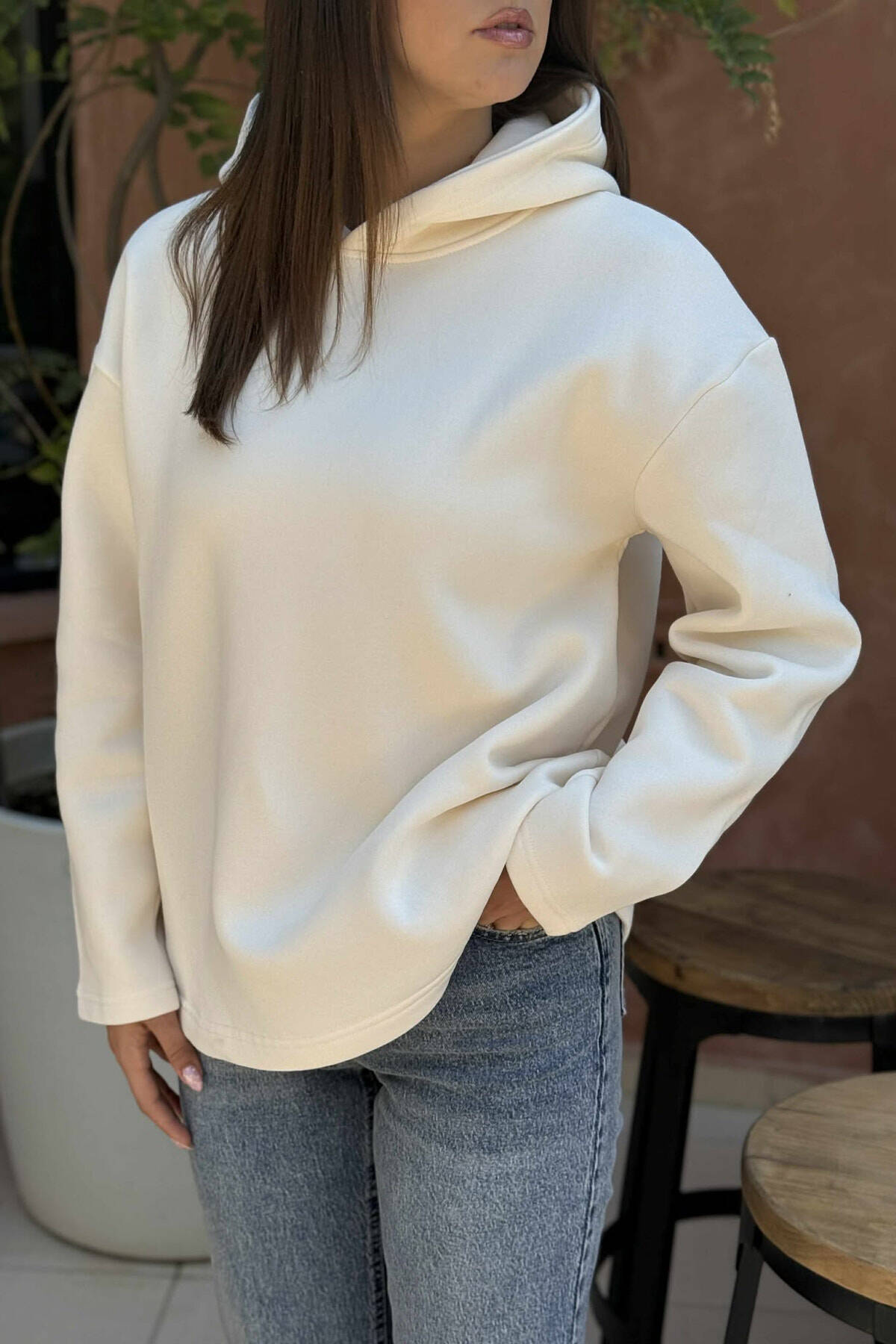 FLUFFY SIMPLE ONE COLOR WOMEN HOODIE CREAM/KREM