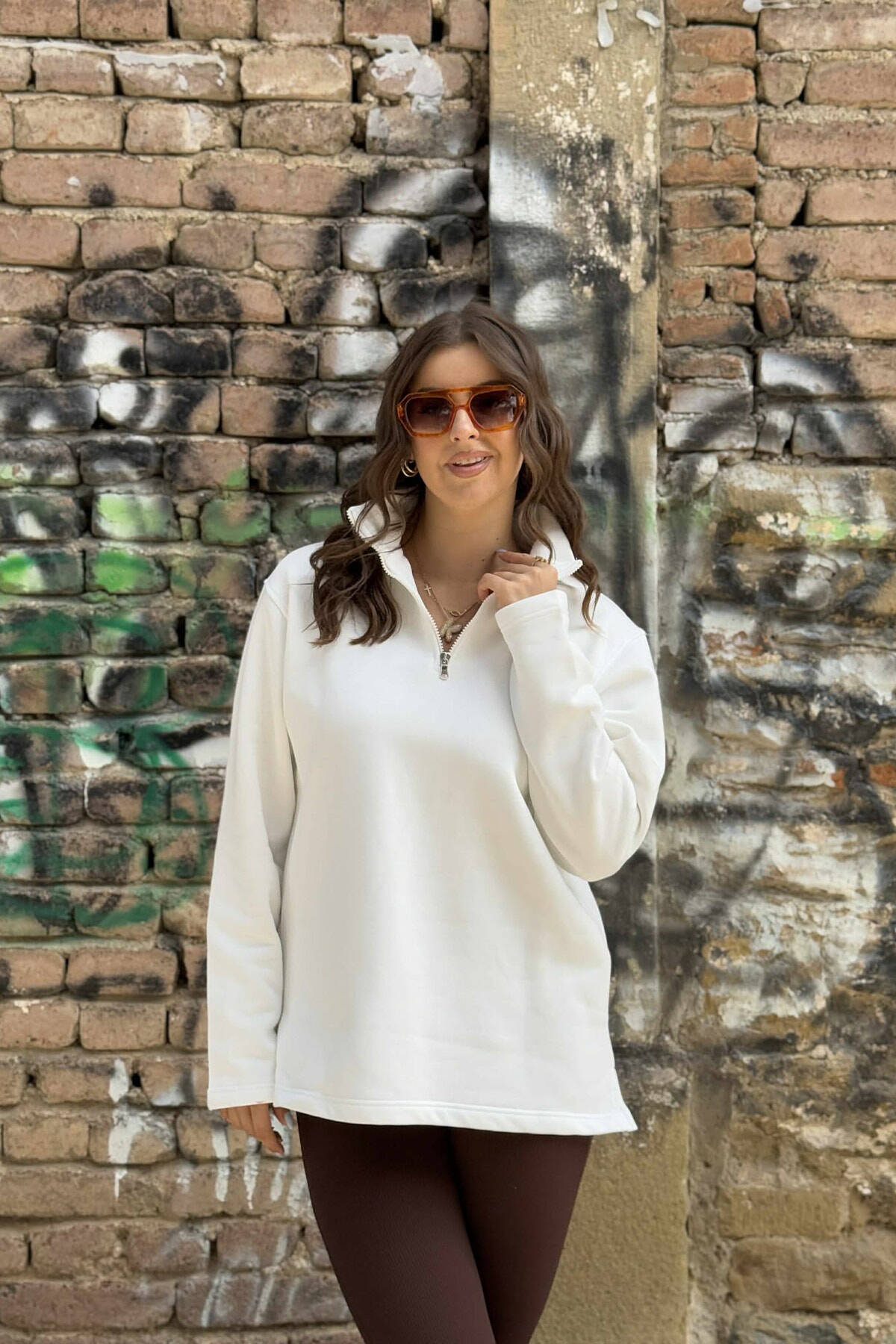 FLUFFY ZIPPER NECK ONE COLOR WOMEN SWEATSHIRT WHITE-E BARDHE