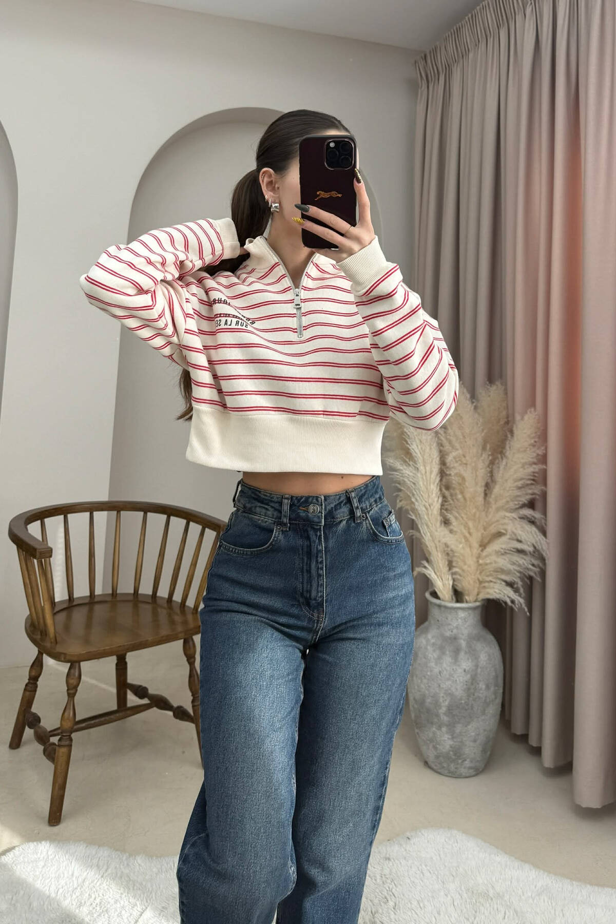 FLUFFY ZIPPER NECK STRIPE WOMEN SWEATSHIRT CREAM/KREM