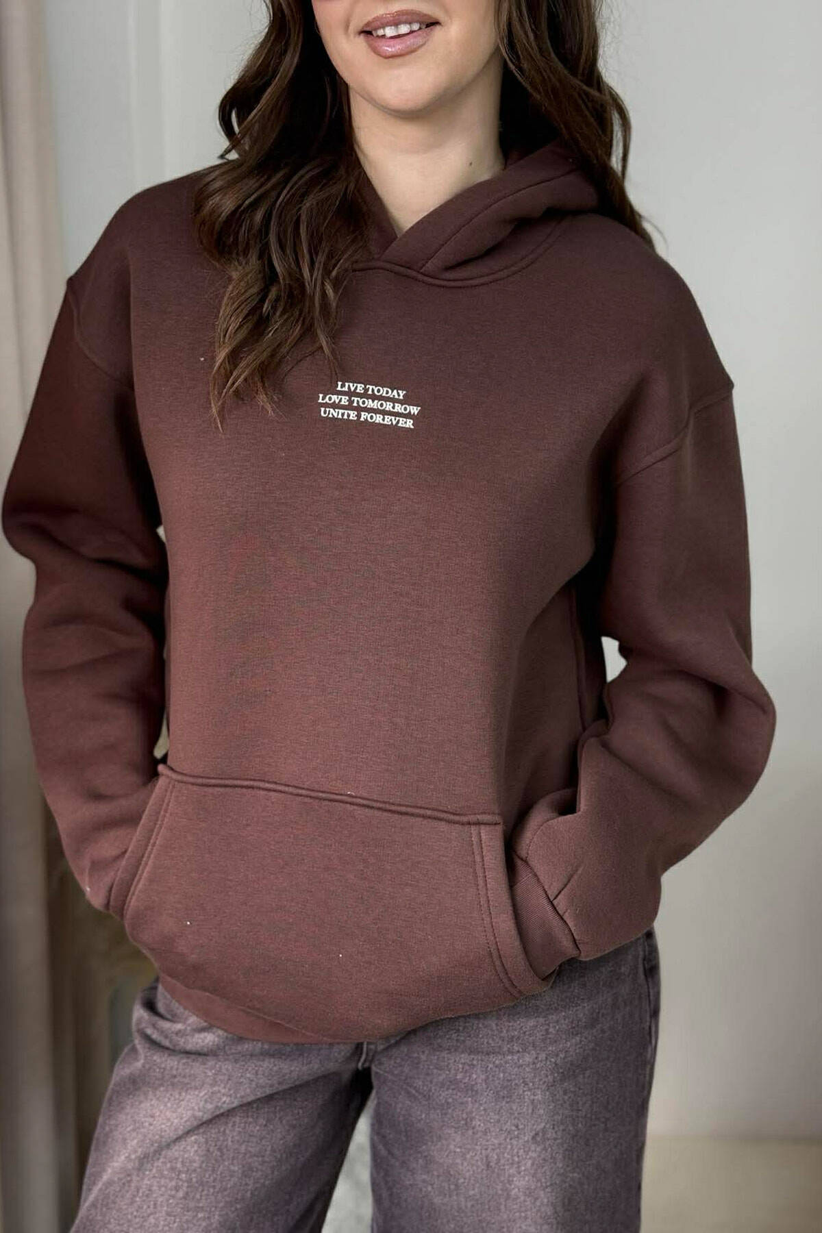 HOODIE ME PUSH DHE SHKRIME NE PJESEN PARA PER FEMRA NE NGJYRE KAFE TE ERRET