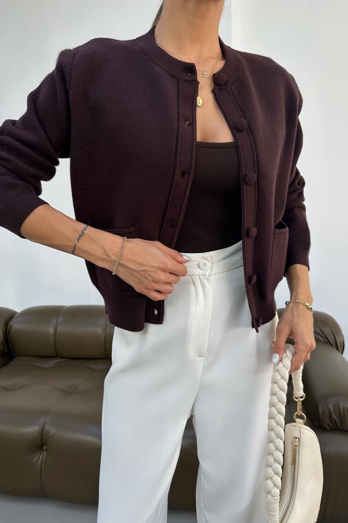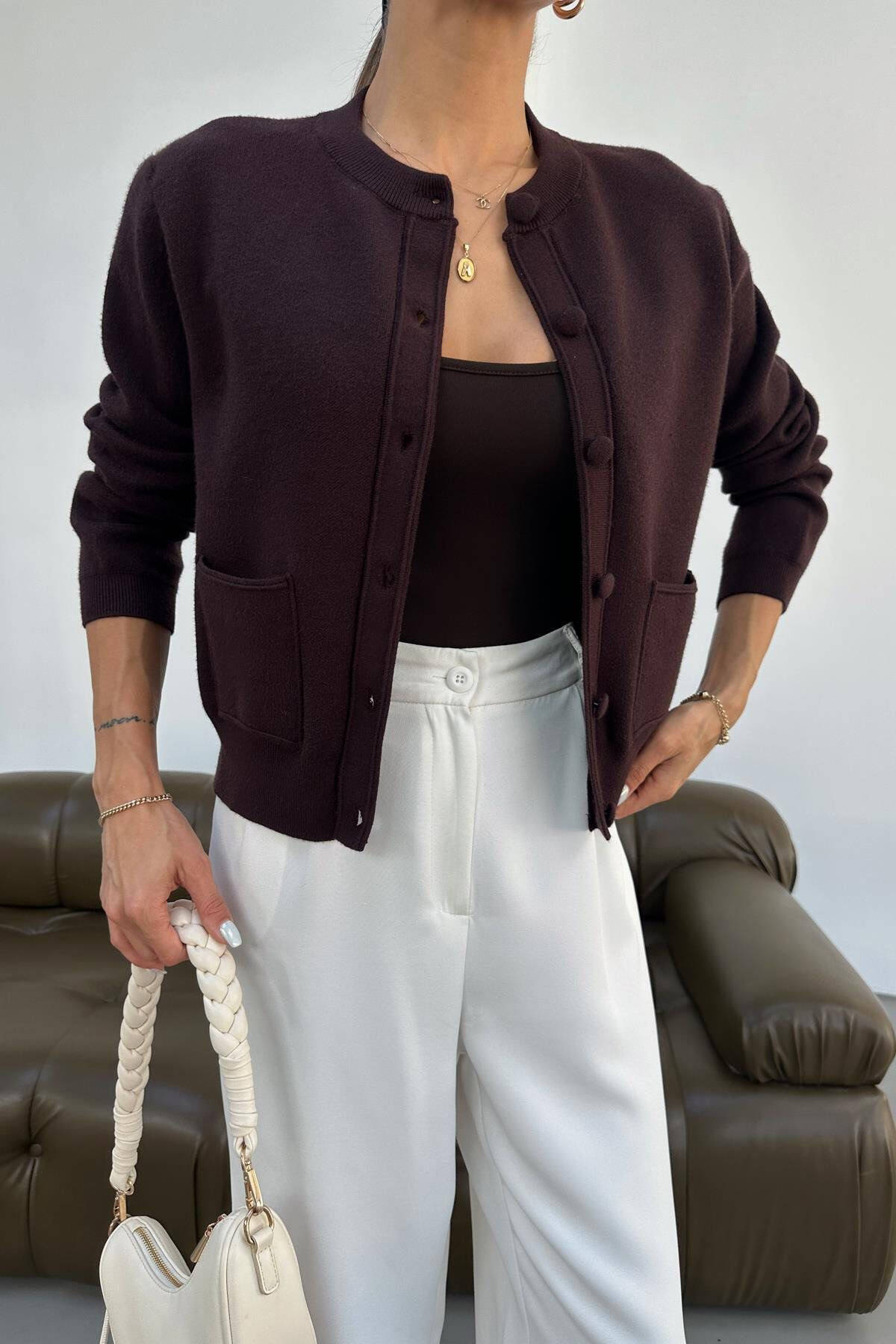 FRONT POCKET ROUND NECK WOMAN CARDIGAN BROWN/KAFE