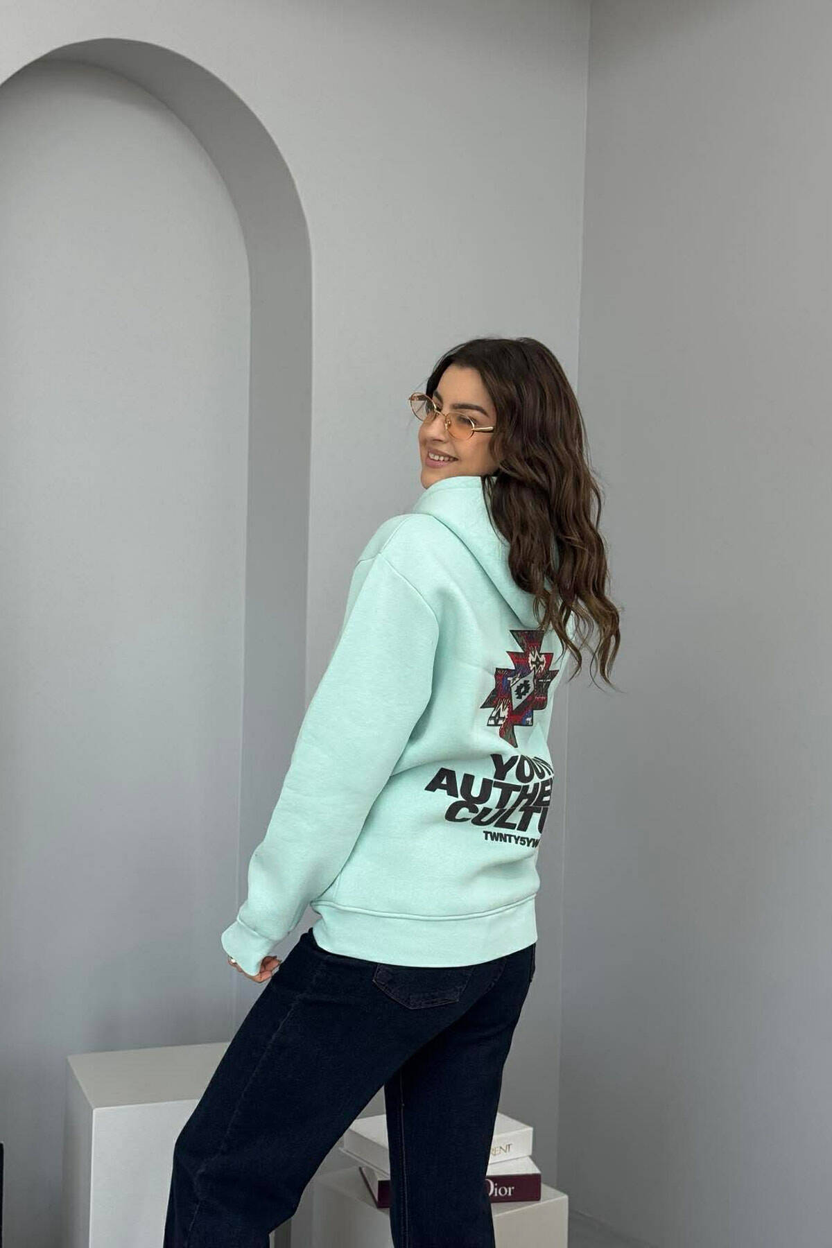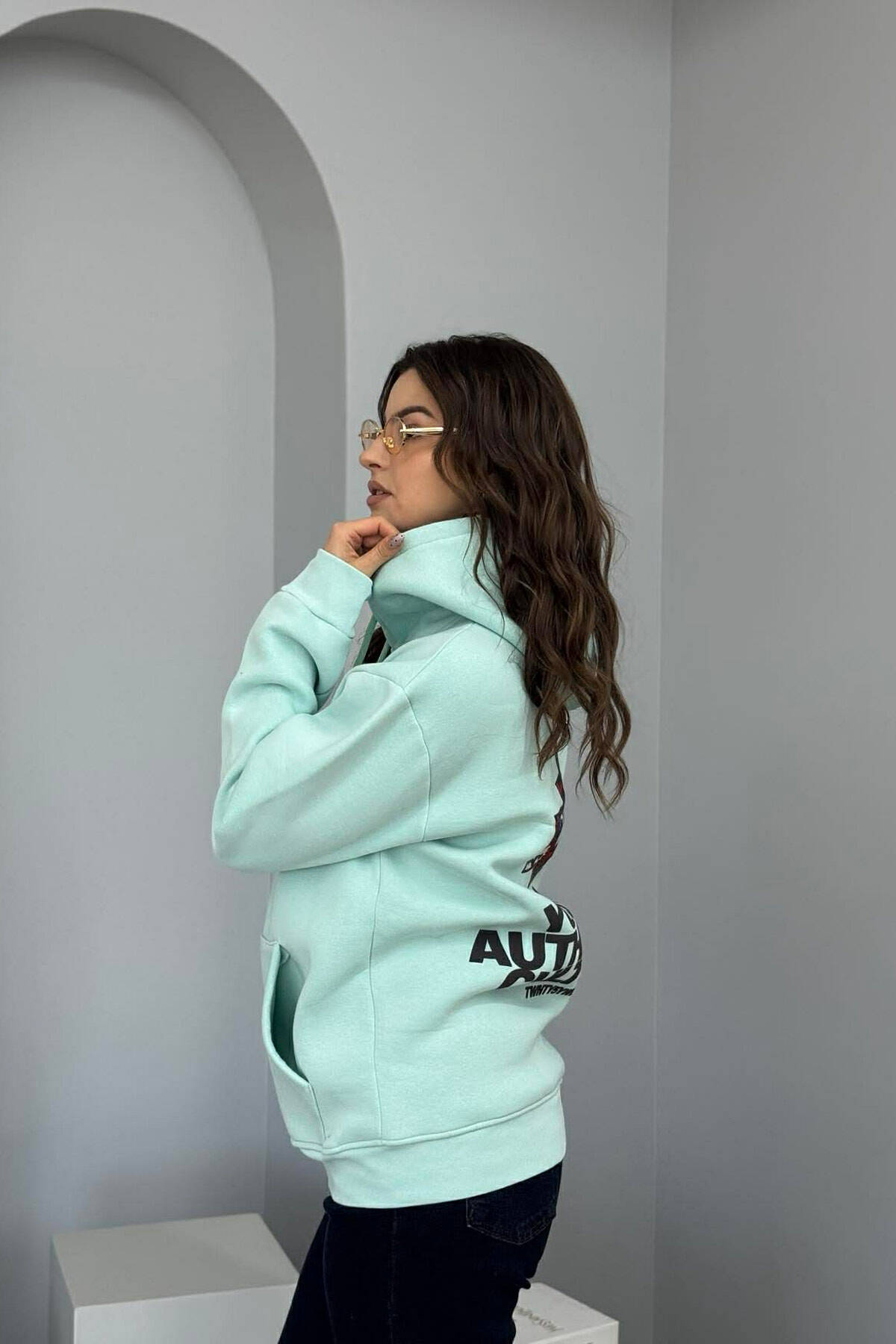 FRONT WRITTINGS & BACK DESIGN FLUFFY WOMEN HOODIE MINT/MENTE