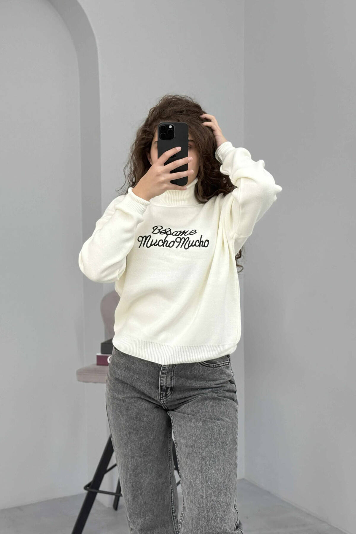 FRONT WRITTINGS TURTLE NECK WOMEN SWEATER WHITE-E BARDHE