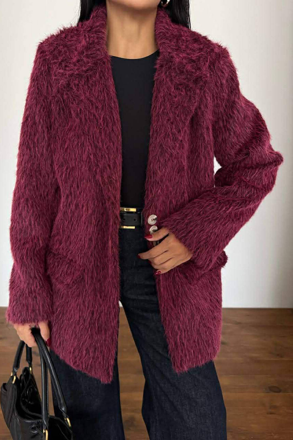 FUR DESIGN BUTTONED WOMAN JACKET BURGUNDY/VISHNJE
