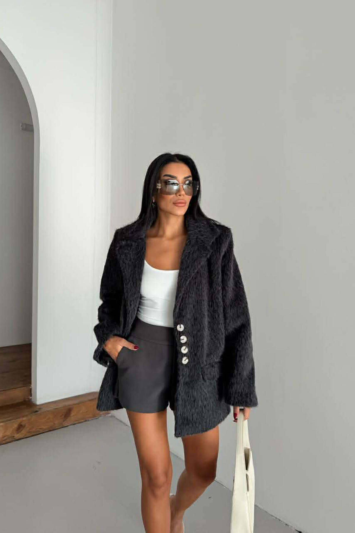 FUR DESIGN BUTTONED WOMAN JACKET DARK GREY/GEE