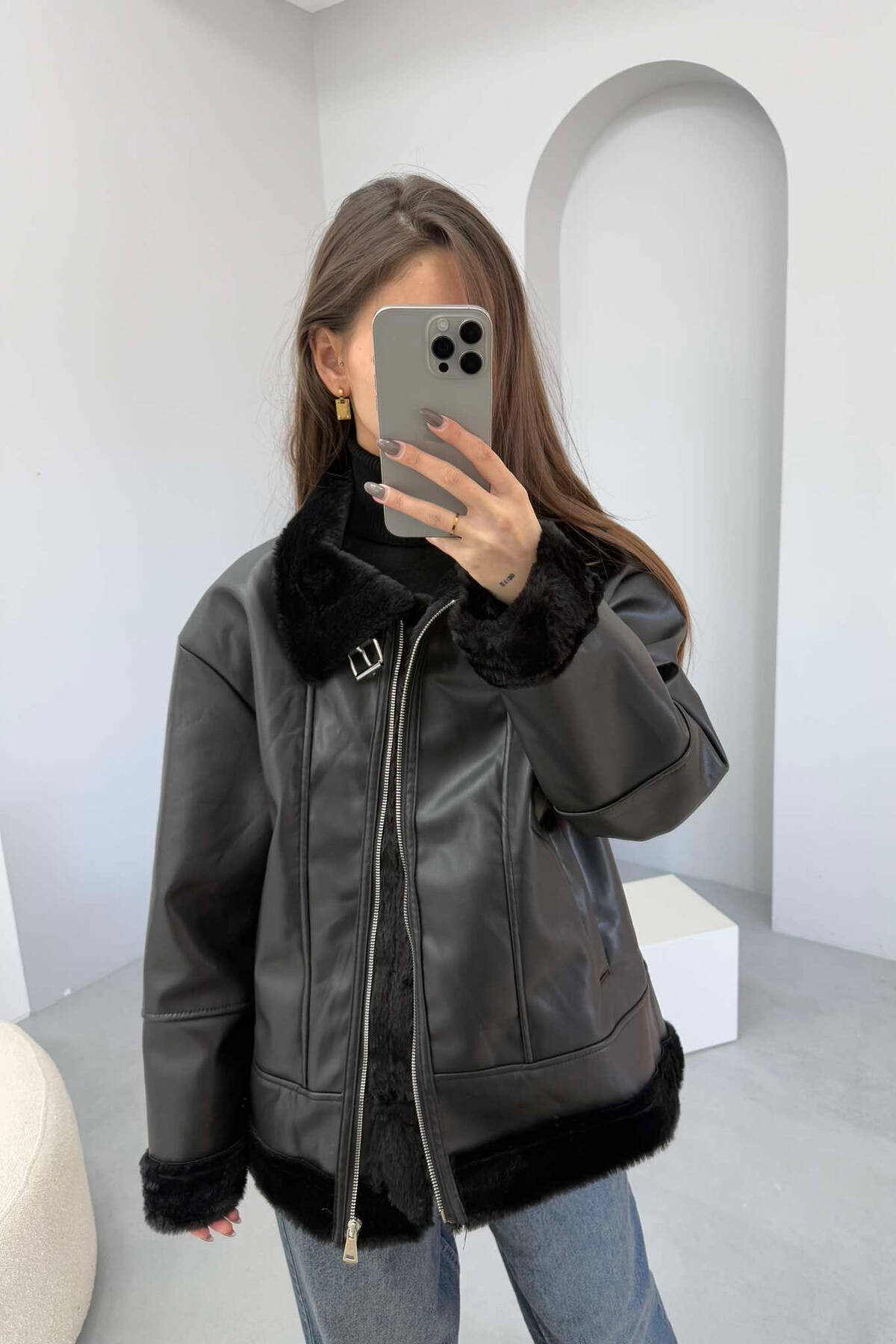 FUR INTERIOR DESIGN LEATHER WOMEN JACKET BLACK/ E ZEZE