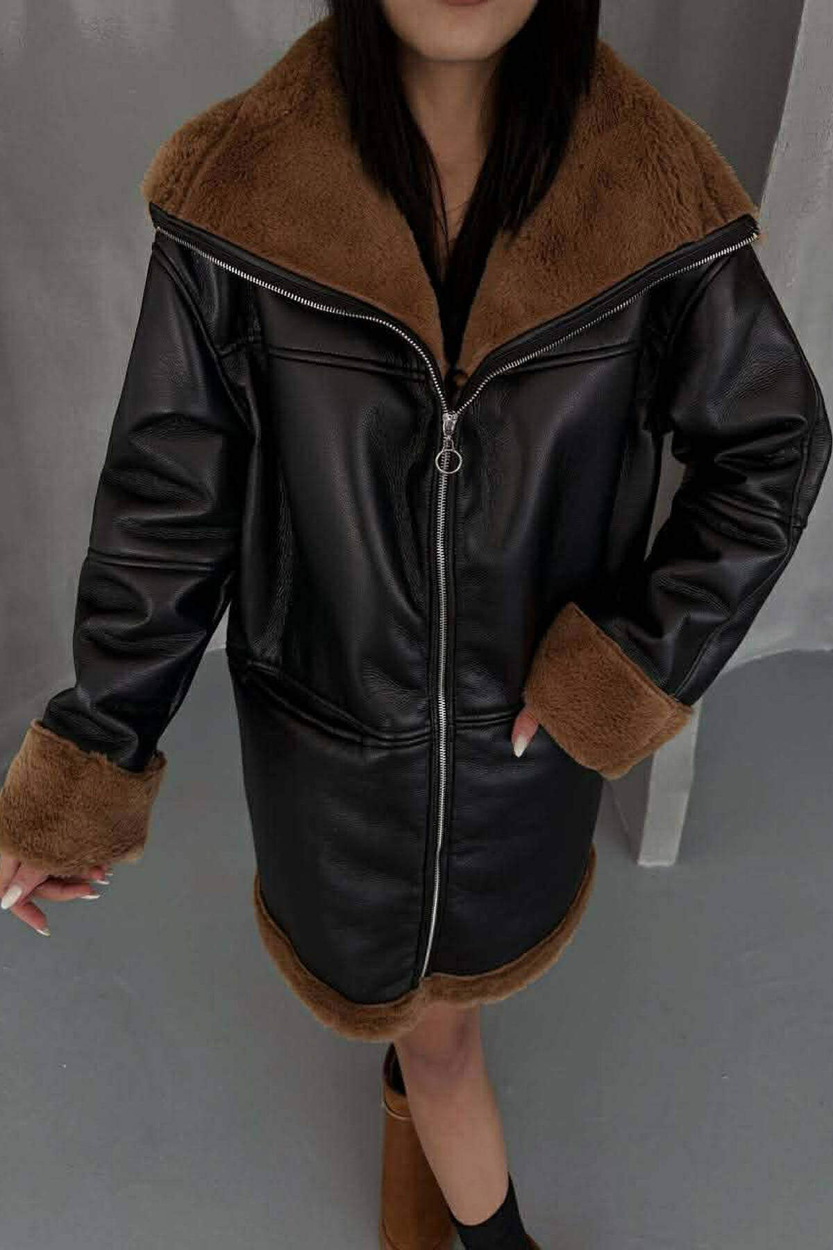 FUR DETAIL DENIM WOMEN JACKET BLACK-BROWN/ZEKA