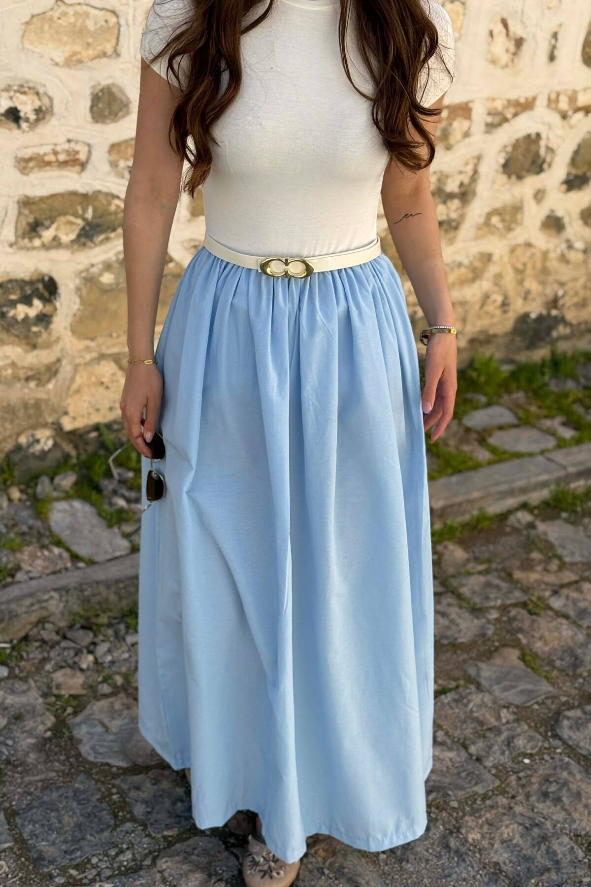 FUSTAN I GJATË ME DETAJIN E RRIPIT PËR FEMRA NË NGJYRËN BLU E ZBARDHUR