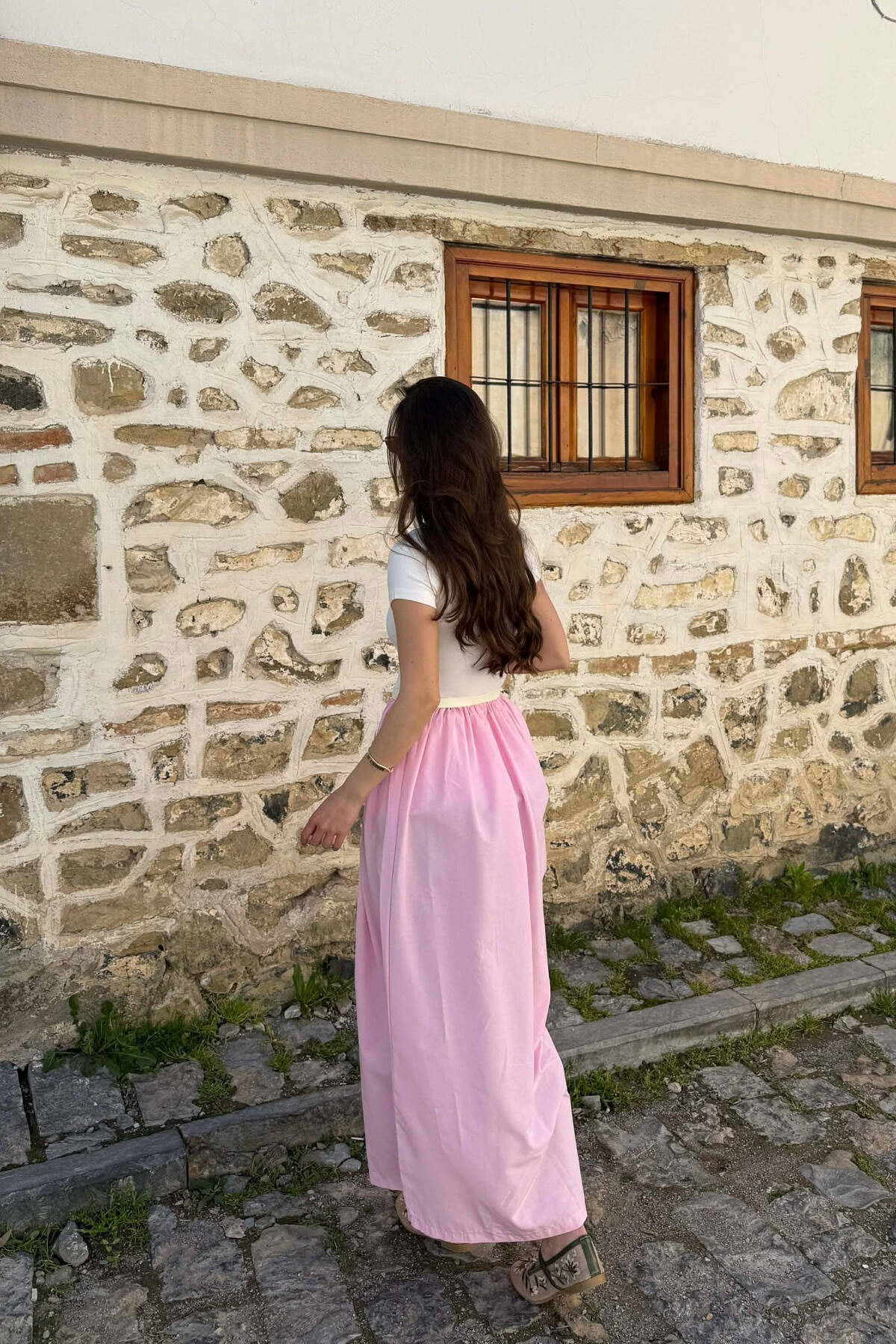 FUSTAN I GJATË ME DETAJIN E RRIPIT PËR FEMRA NË NGJYRËN ROZË