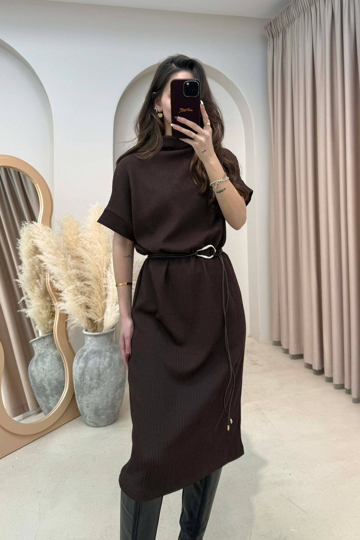 ONE COLOR LACING BELT POLO NECK WOMEN DRESS POWDER/PUDER