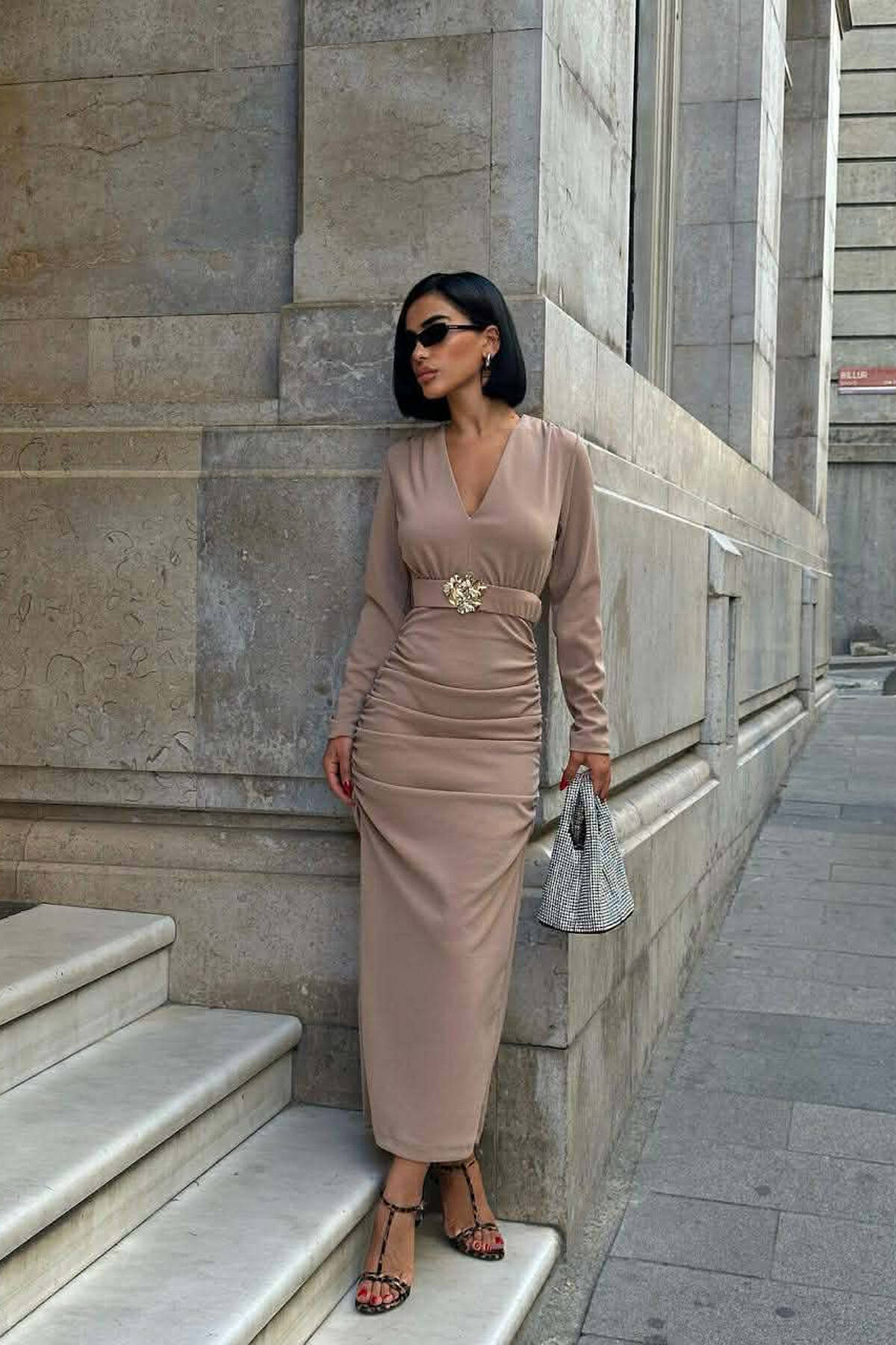 FUSTAN NJE NGJYRESH PA MENGE ME DETAJIN E BUTONAVE GOLD PER FEMRA NE NGJYRE BEZHE