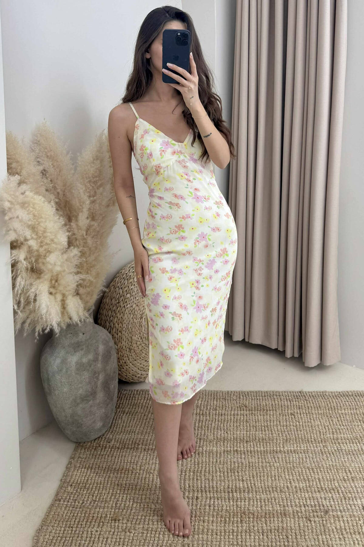 Fustani ka gjatesi mesatare me nje te care ne te majten e tij, eshte i ngushte me dekolte V dhe me rripa.