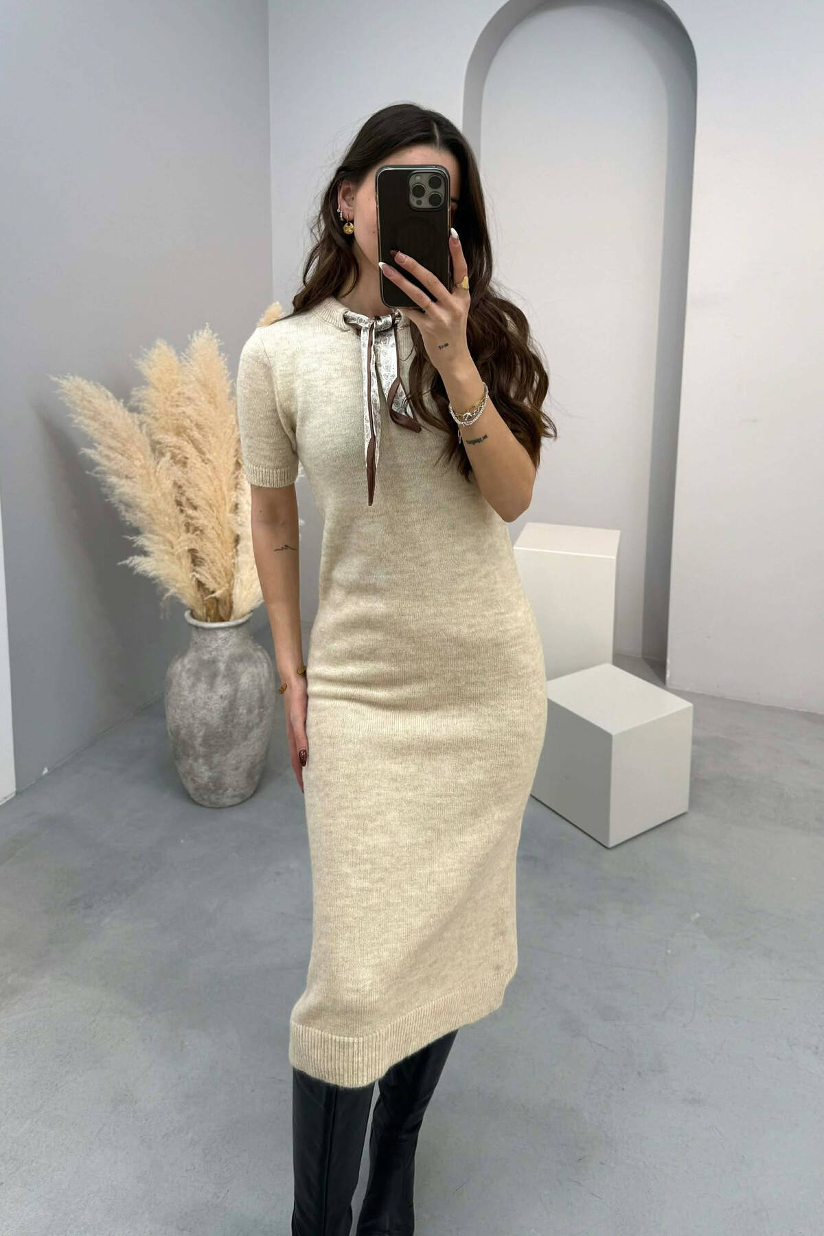 SHORT SLEEVES SCARF DETAIL KNIT WOMEN DRESS BURGUNDY/VISHNJE