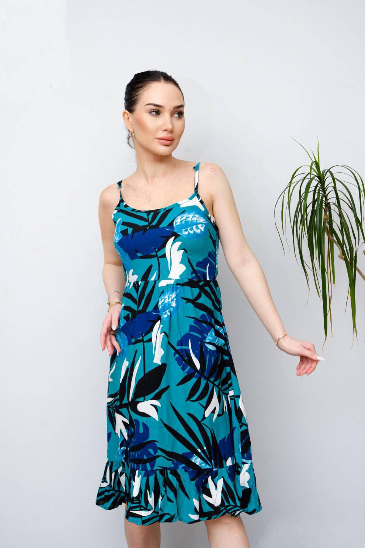 Fustan me motivin e gjetheve per femra ne ngjyren jeshile