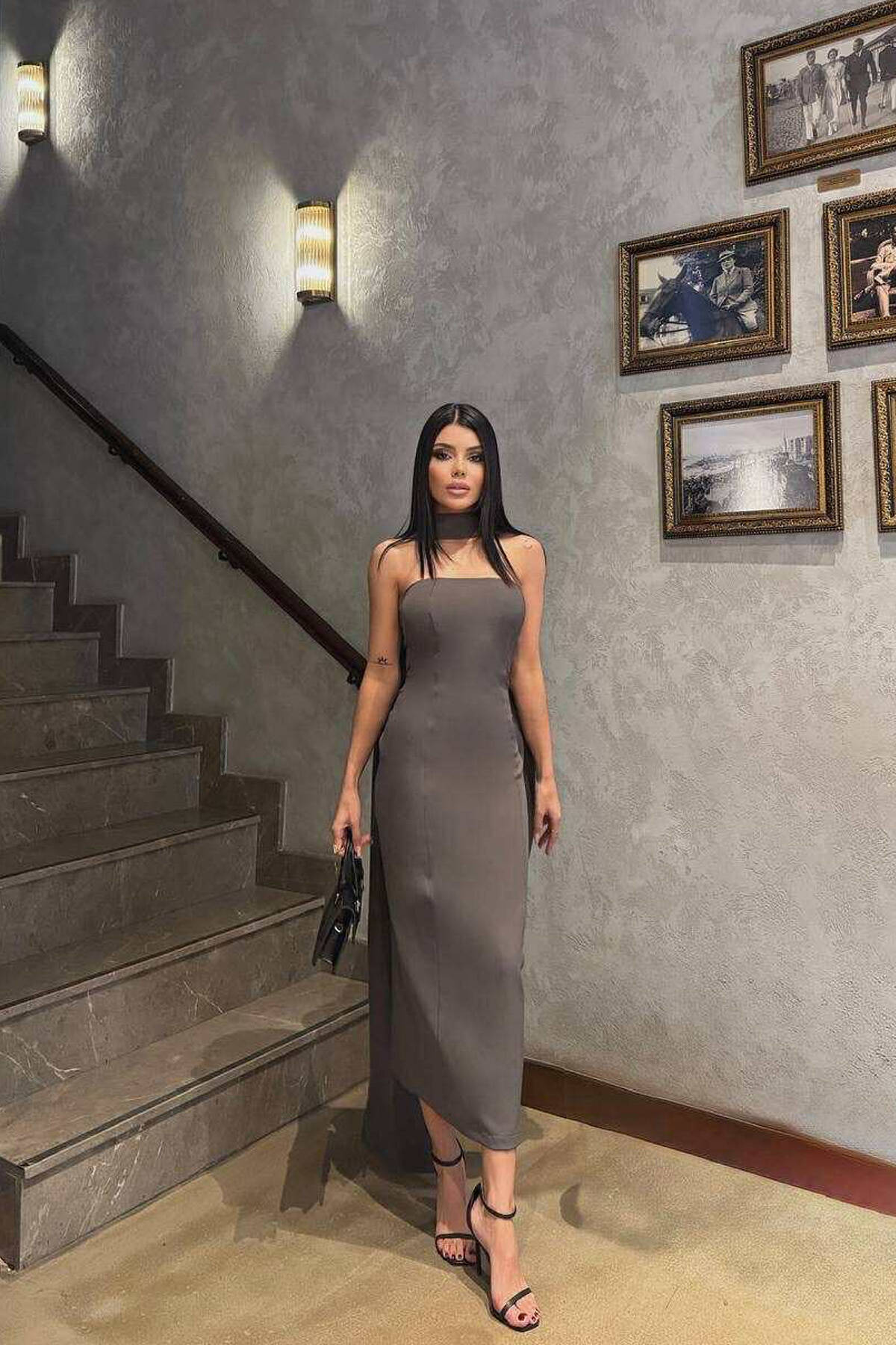 FUSTAN NJË NGJYRËSH ME DETAJIN E SHALLIT PËR FEMRA NË NGJYRËN GRI E ERRËT