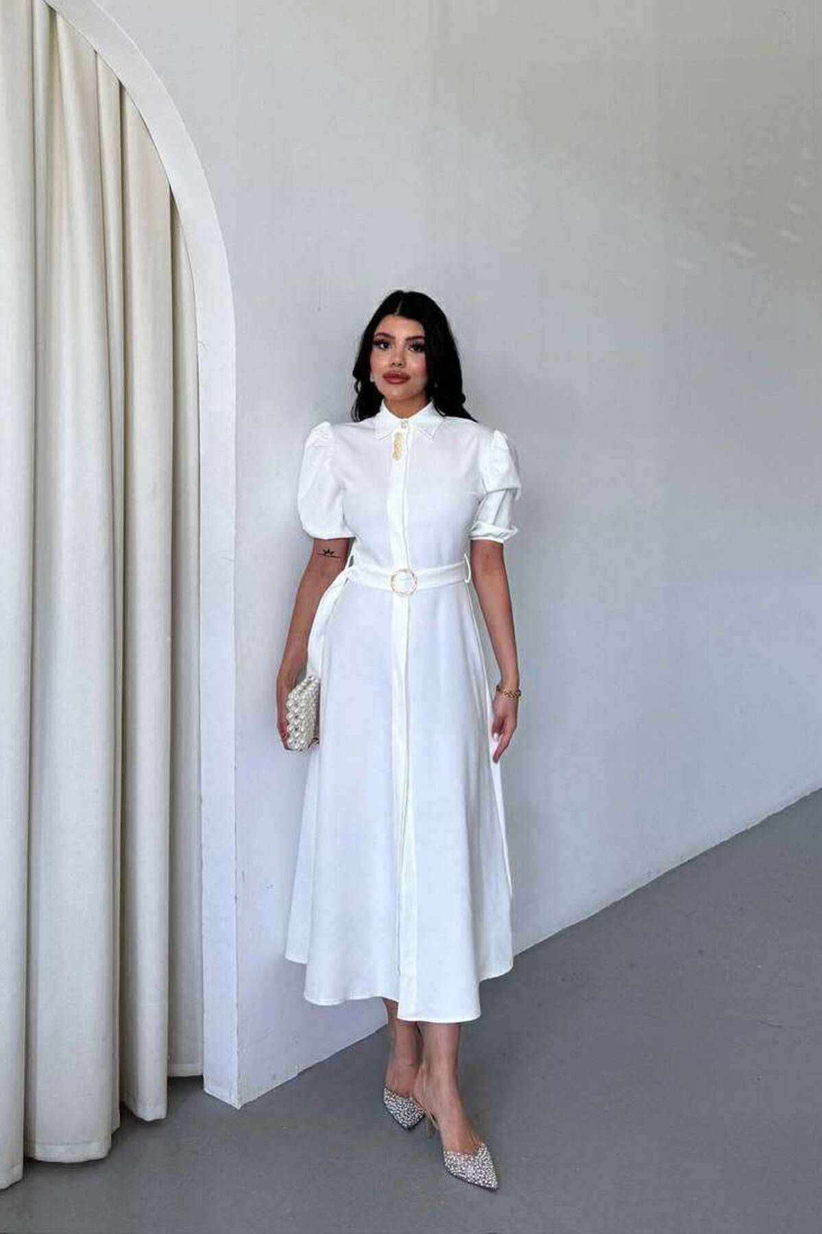 FUSTAN NJË NGJYRËSH ME JAKË POLO DHE LIDHËSE NË BEL PËR FEMRA NË NGJYRË TË BARDHË