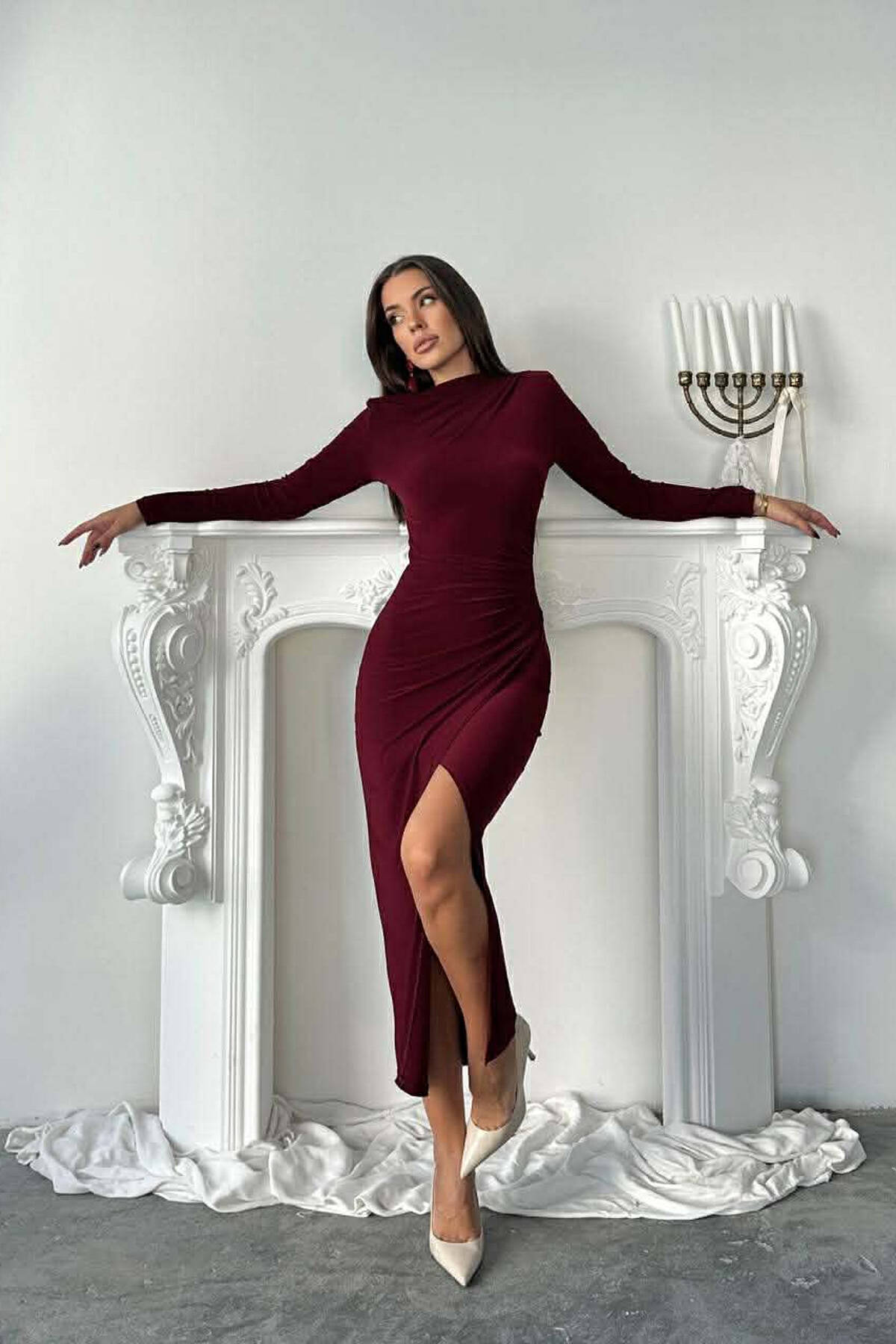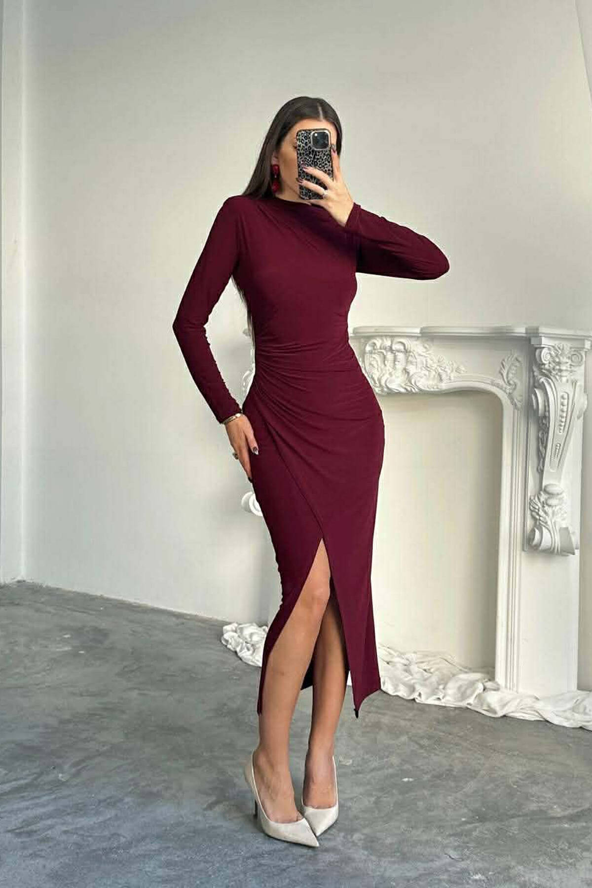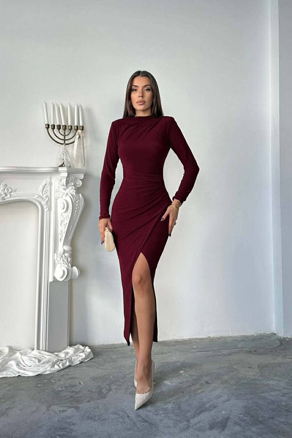 FUSTAN NJË NGJYRËSH ME MËNGË TË GJATA PËR FEMRA NË NGJYRE VISHNJE