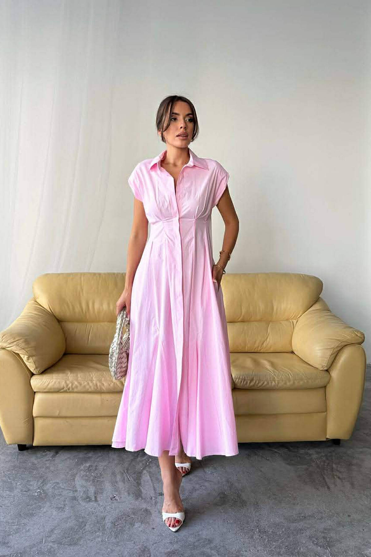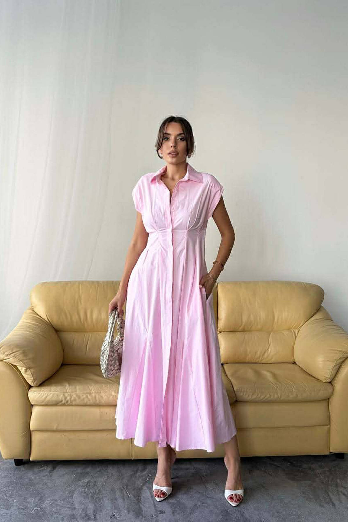 FUSTAN NJE NGJYRESH PA MENGE DHE BUTONA PER FEMRA NE NGJYRE ROZE TE ZBARDHUR