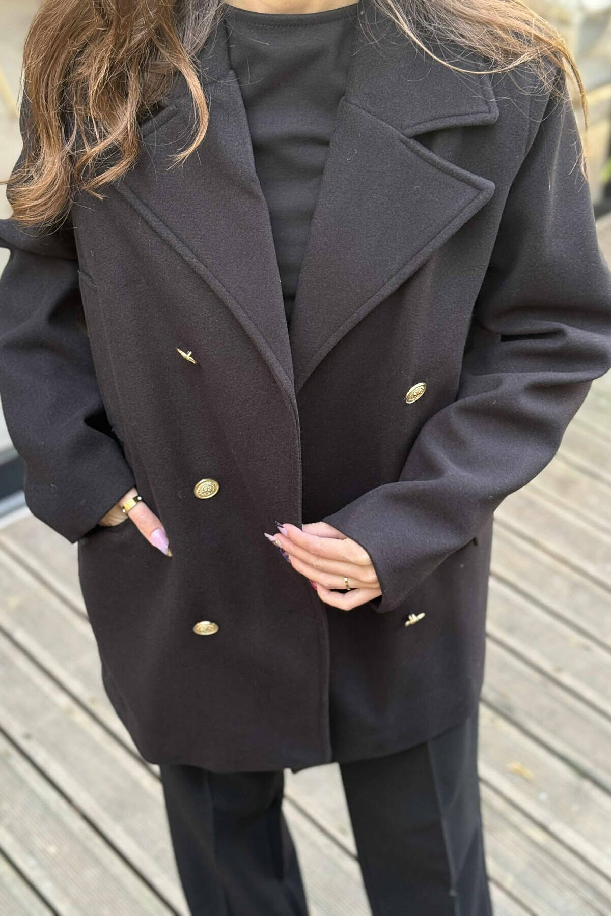 GOLD BUTTONS DETAIL SIMPLE WOMEN COAT BLACK/ E ZEZE