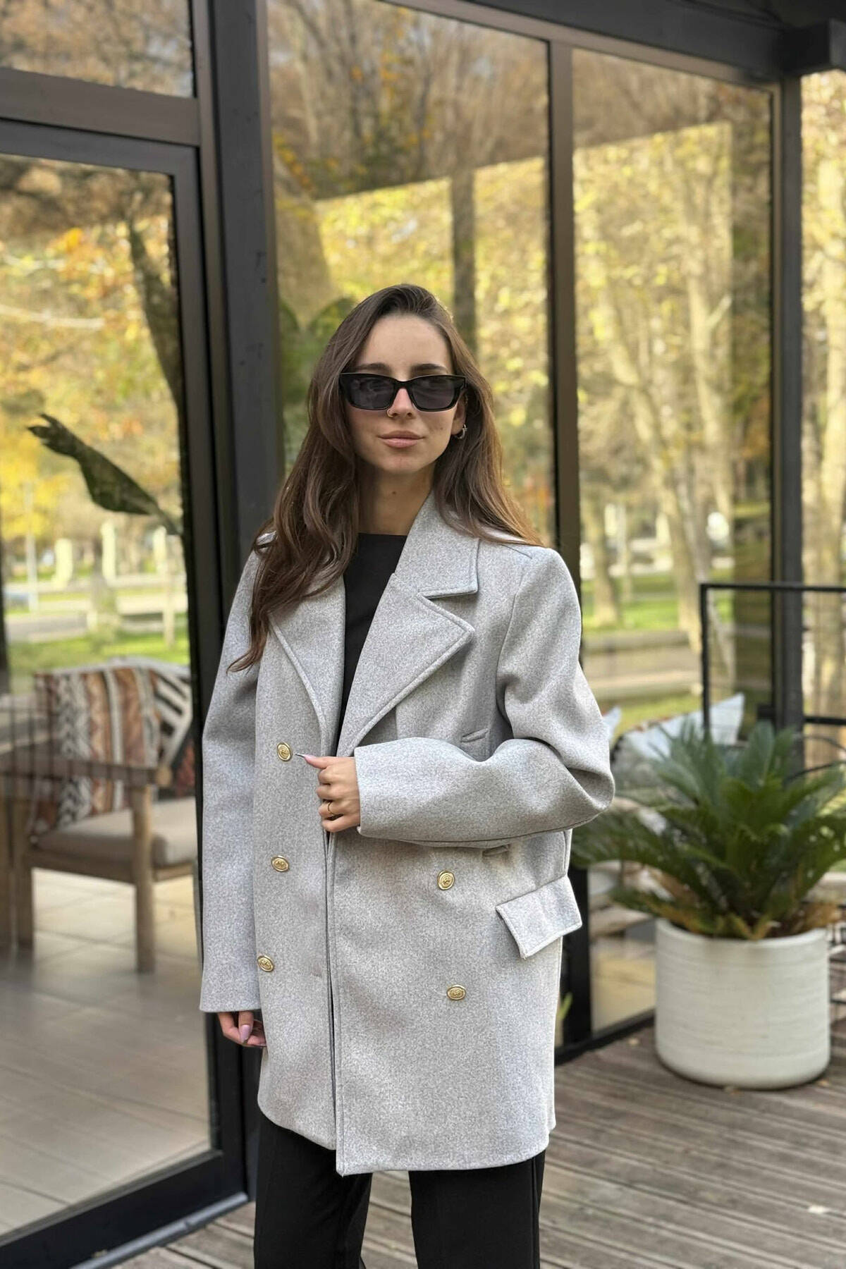 GOLD BUTTONS DETAIL SIMPLE WOMEN COAT LIGHT GREY/GZ