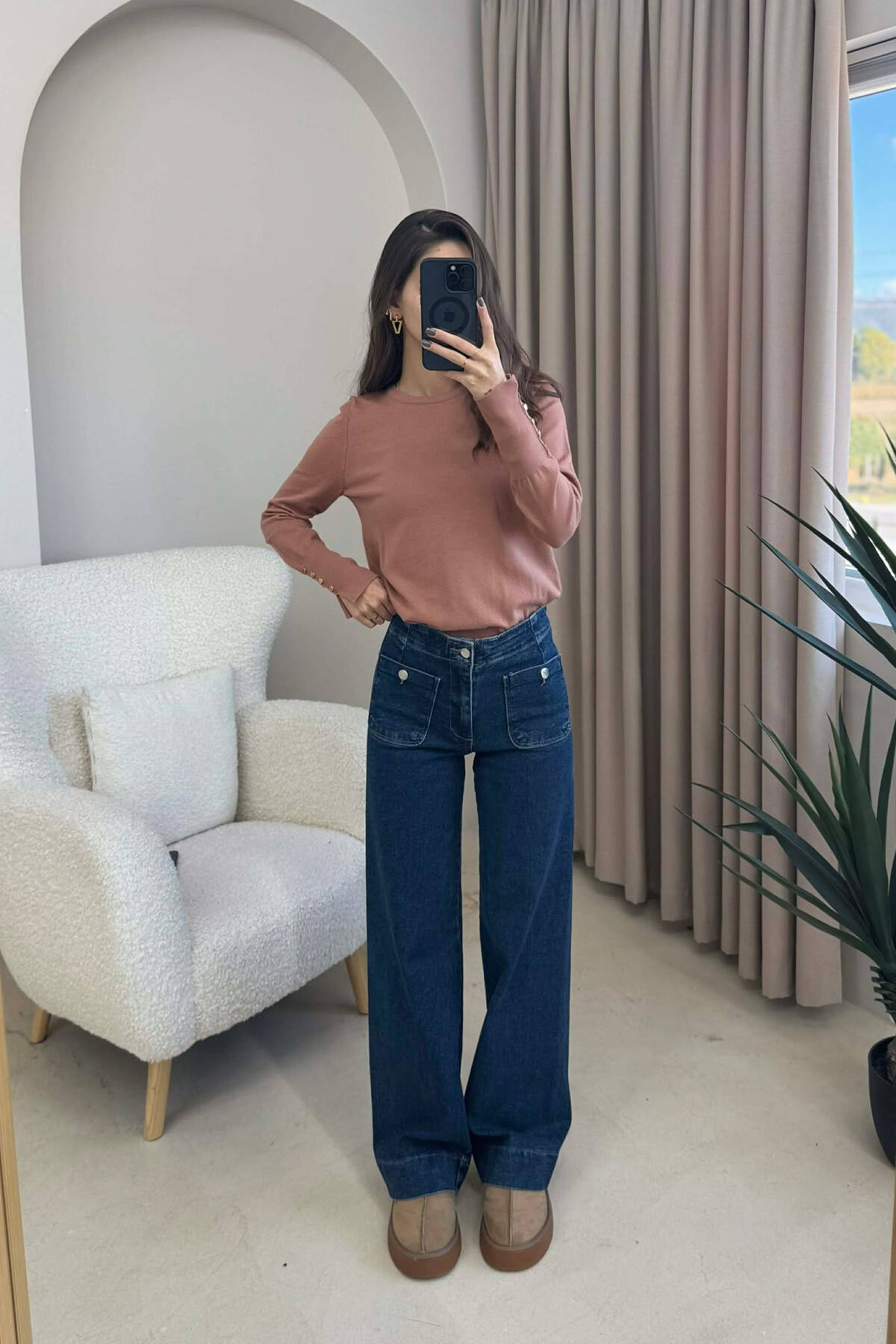 GOLD BUTTONS DETAILS ONE COLOR WOMEN SWEATER BROWN/KAFE