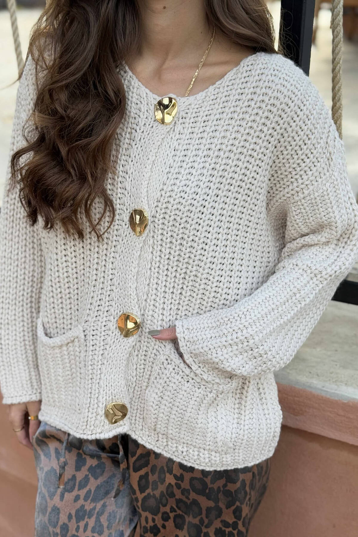GOLD BUTTONS KNITTED ONE COLOR WOMEN CARDIGAN CREAM/KREM