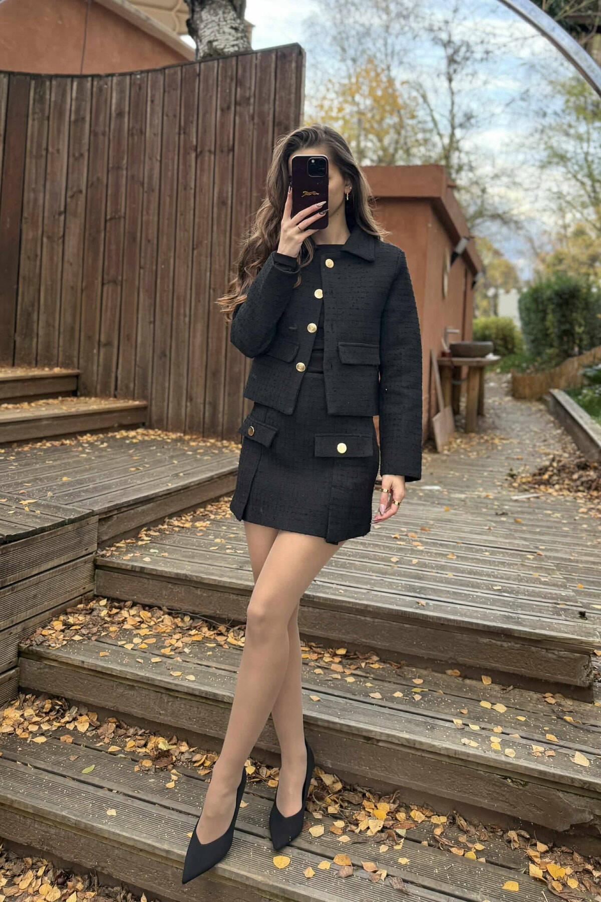 GOLD BUTTONS ONE COLOR JACKET+SKIRT WOMEN SET BLACK/ E ZEZE
