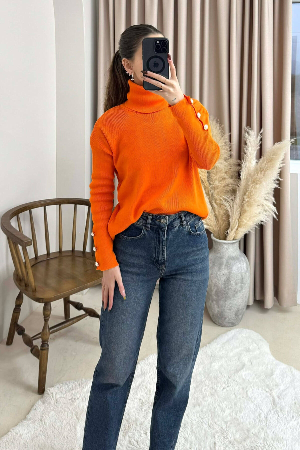 Më njoftoni kur të rikthehetPërjetoni elegancën në çdo detaj me pulovrën tonë portokalli për femra me qafë të lartë, me mëngë elegante me butona. Kjo nderthurje komode i shton sofistikimin veshjeve tuaja dimërore.