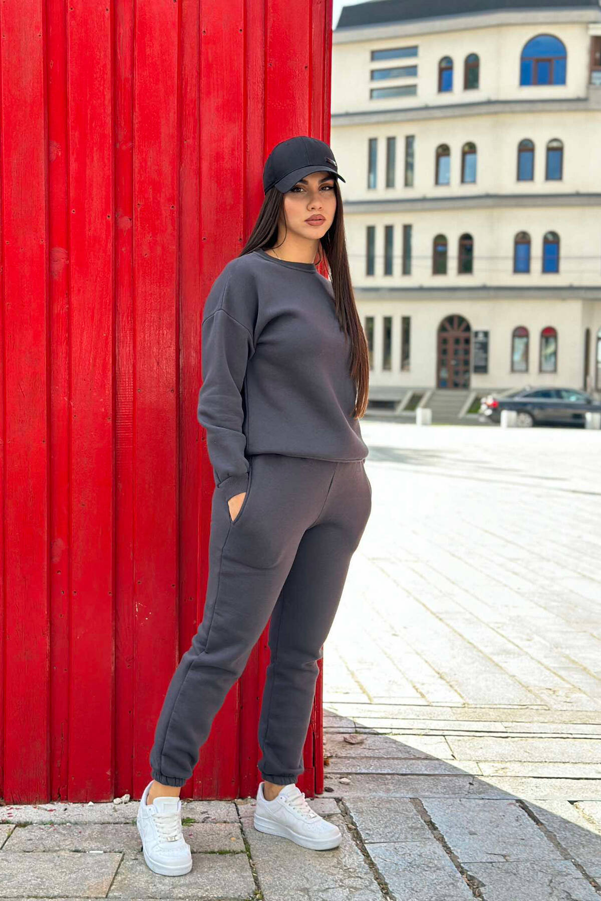 KOSTUM BLUZË DHE TUTA ME LOGON E NJË ZEMRE PËR FEMRA NË NGJYRËN GRI TË ERRËT
