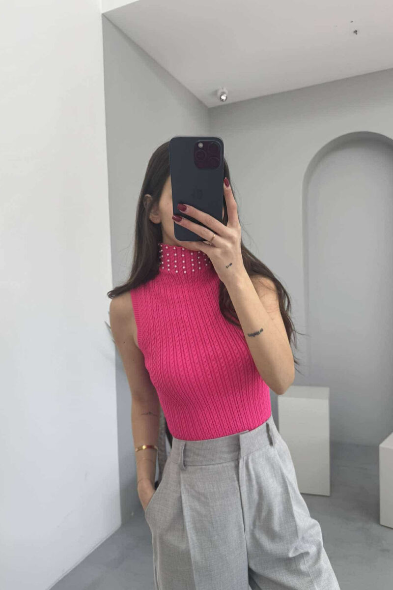 HGH NECK PEARL DETAILS KNITTED WOMEN TANK TOP FUCHSIA/CIKLAMI