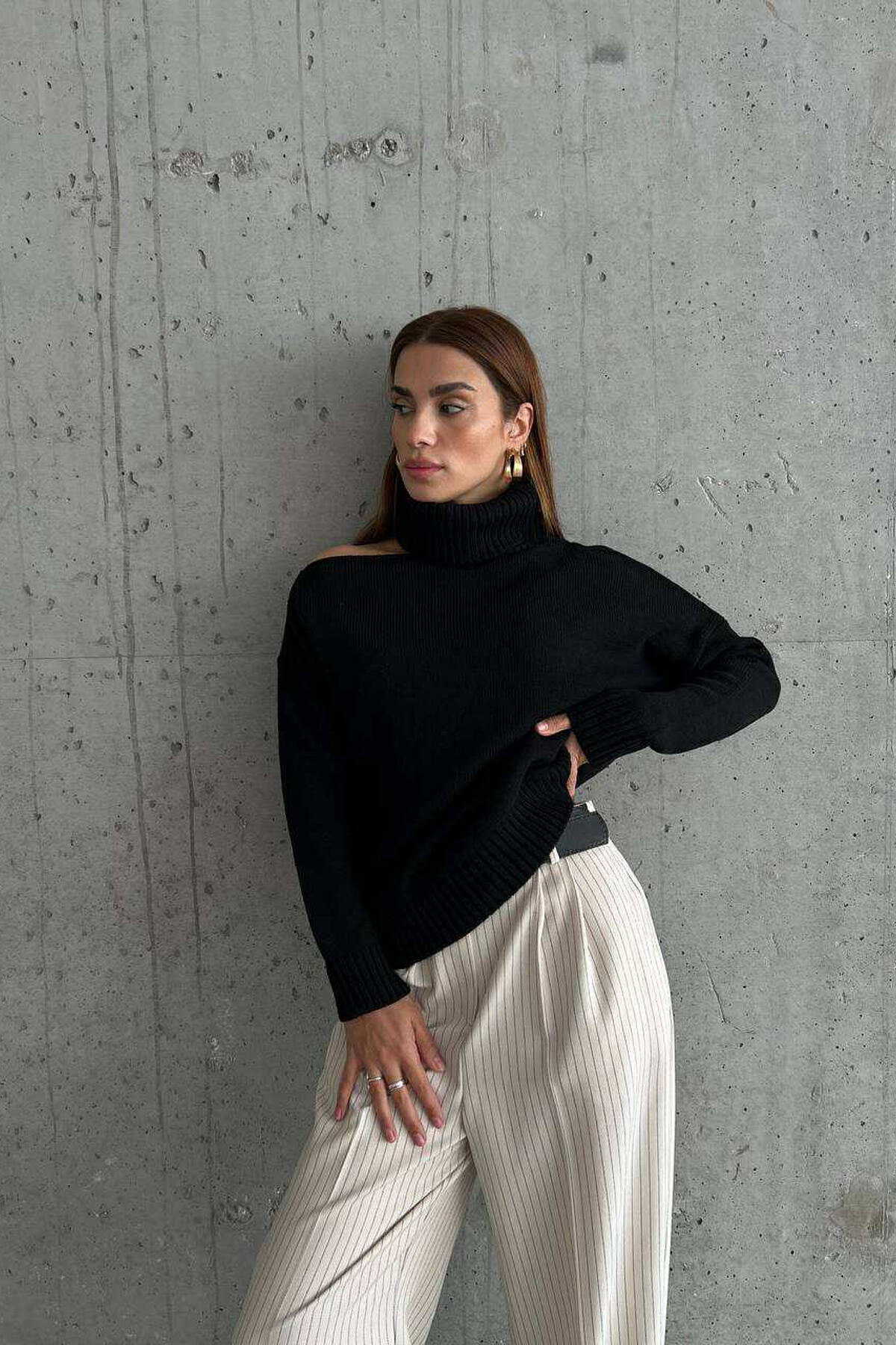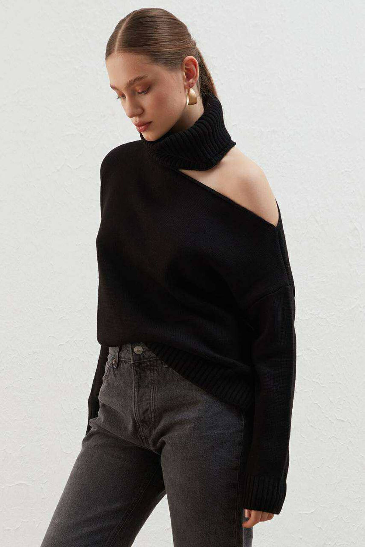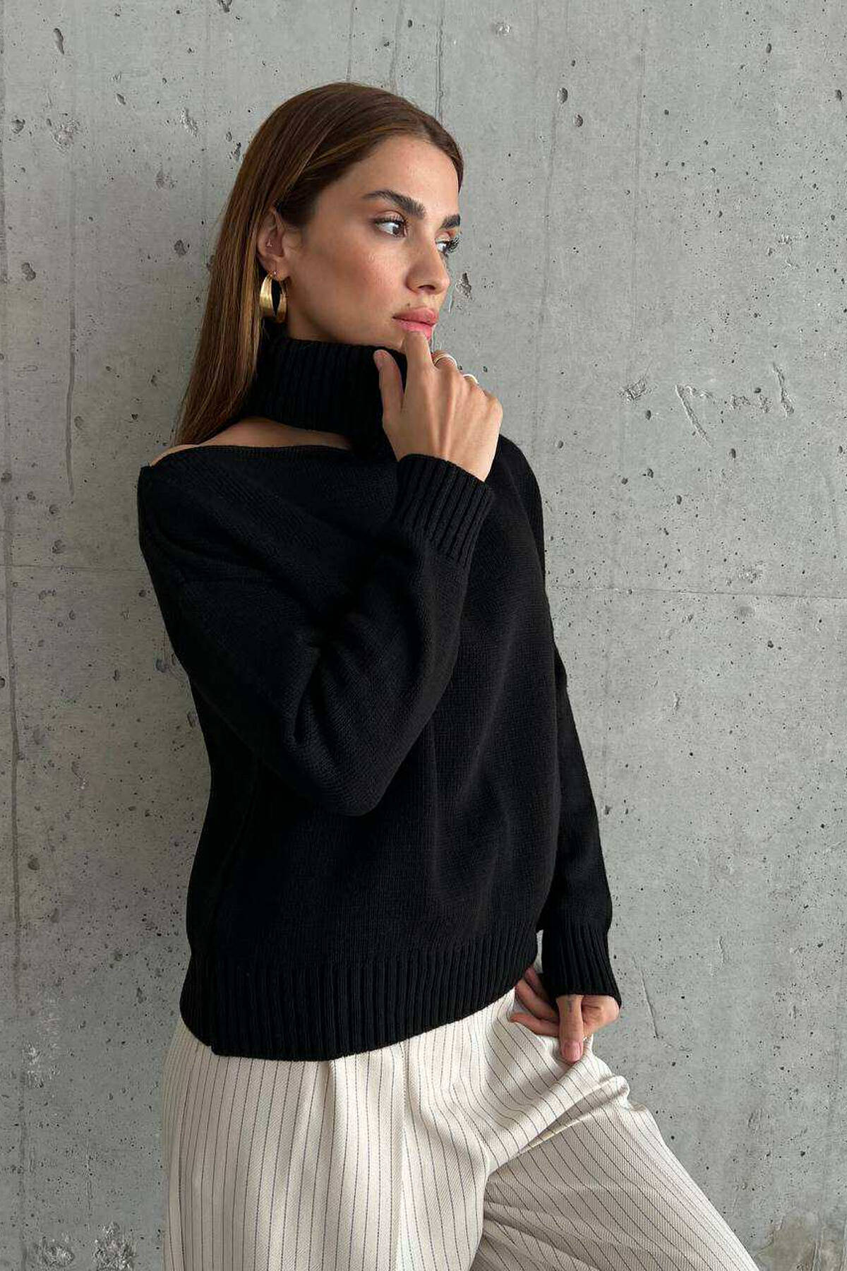 Make this stylish sweater yours. With one-shoulder details on the outside, and the warmest material you've ever tried.