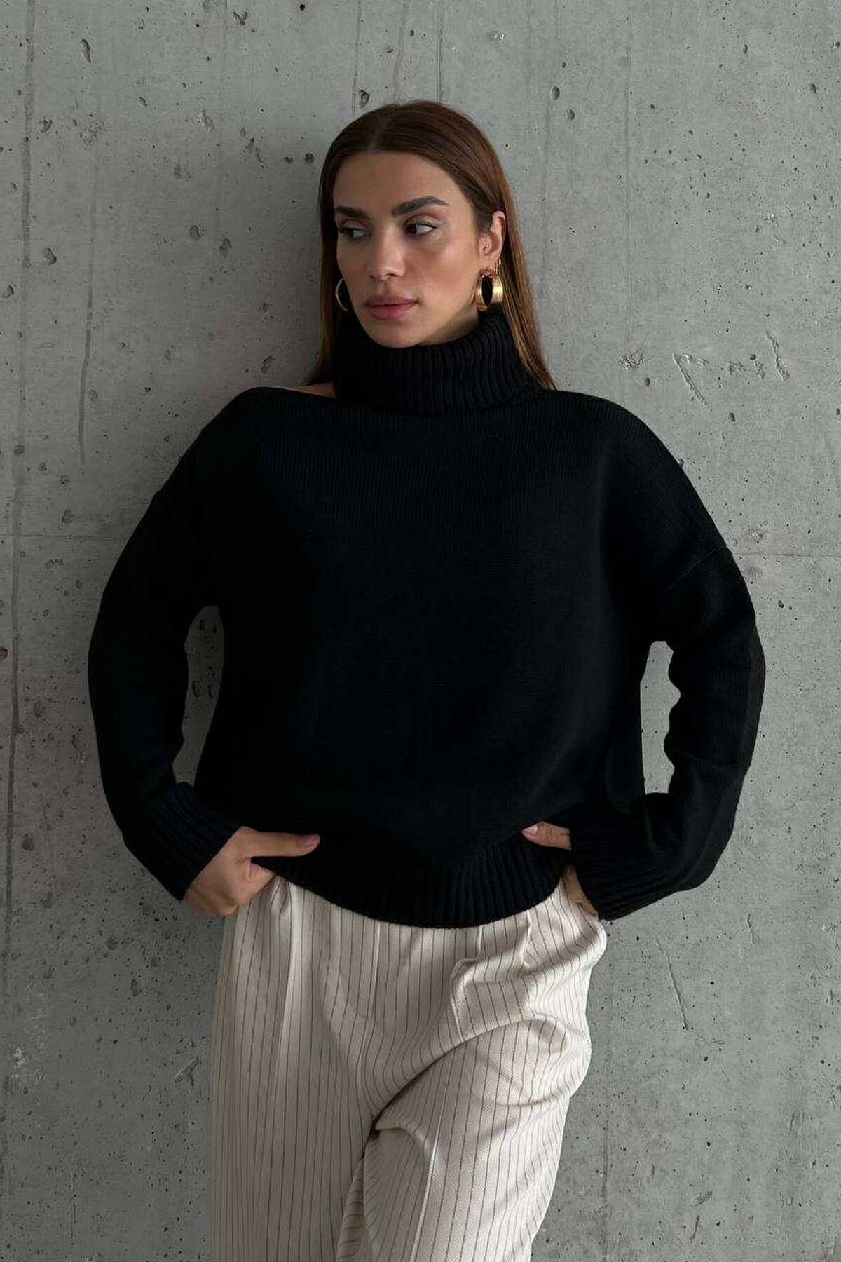 One Color High Neck Sweater For Women In Black