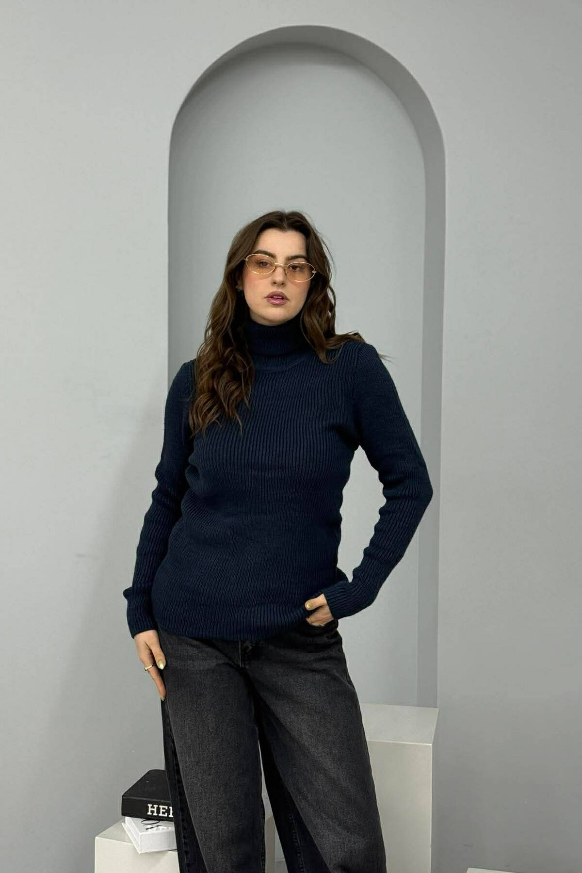 HIGH NECK SIMPLE ONE COLOR WOMEN SWEATER DARK BLUE/BEE