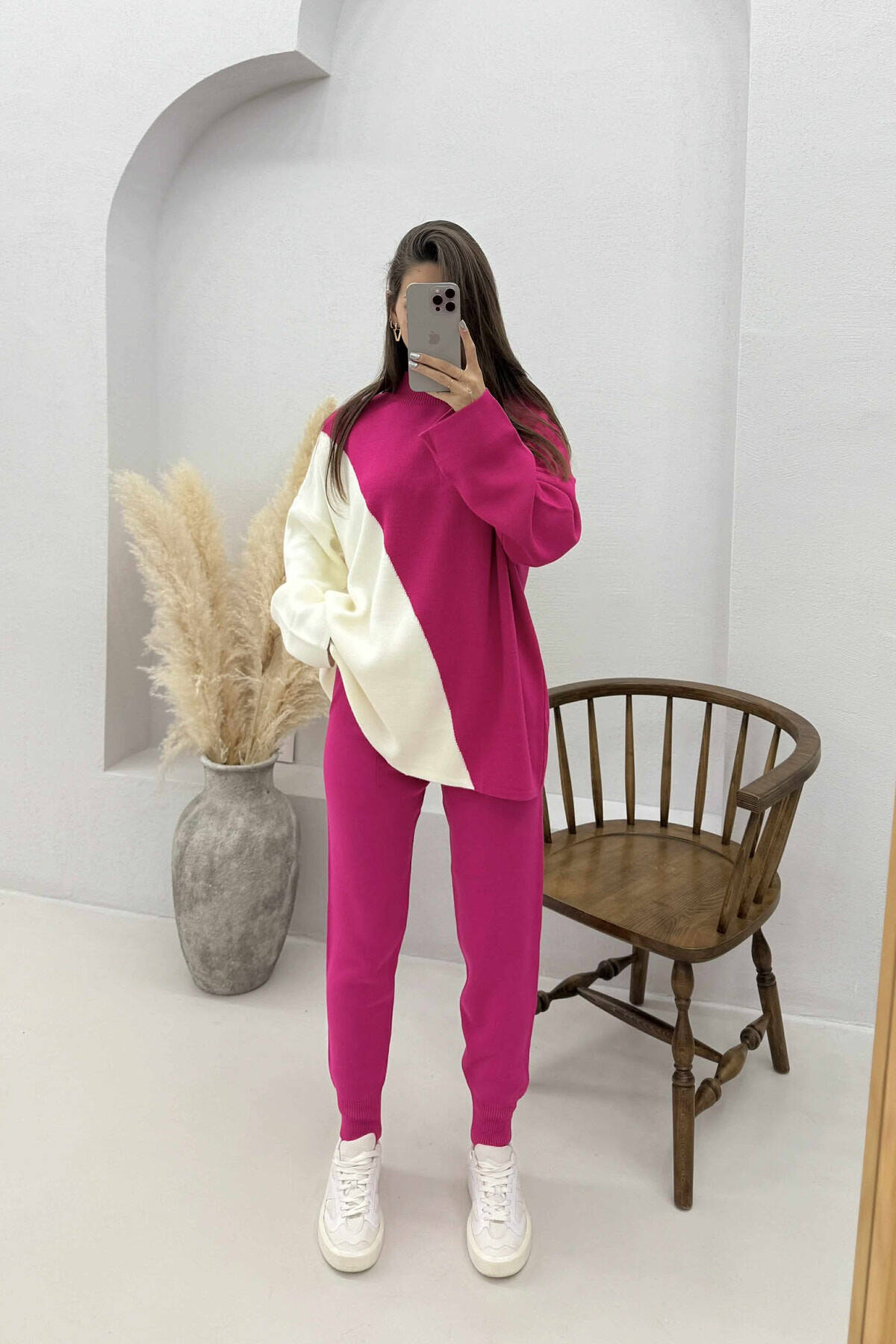 SEMI NECK SWEATER+TROUSERS KNIT WOMEN SET FUCHSIA-WHITE/CIK-BA