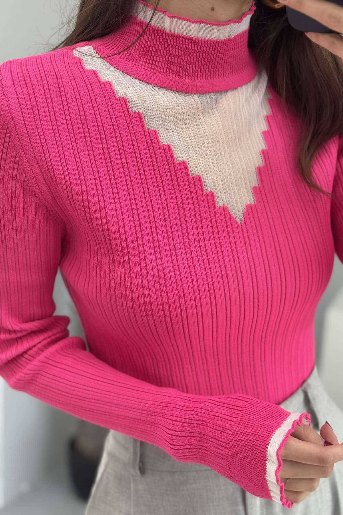 HIGH NECK TRIMMED WOMEN SWEATER FUCHSIA/CIKLAMI