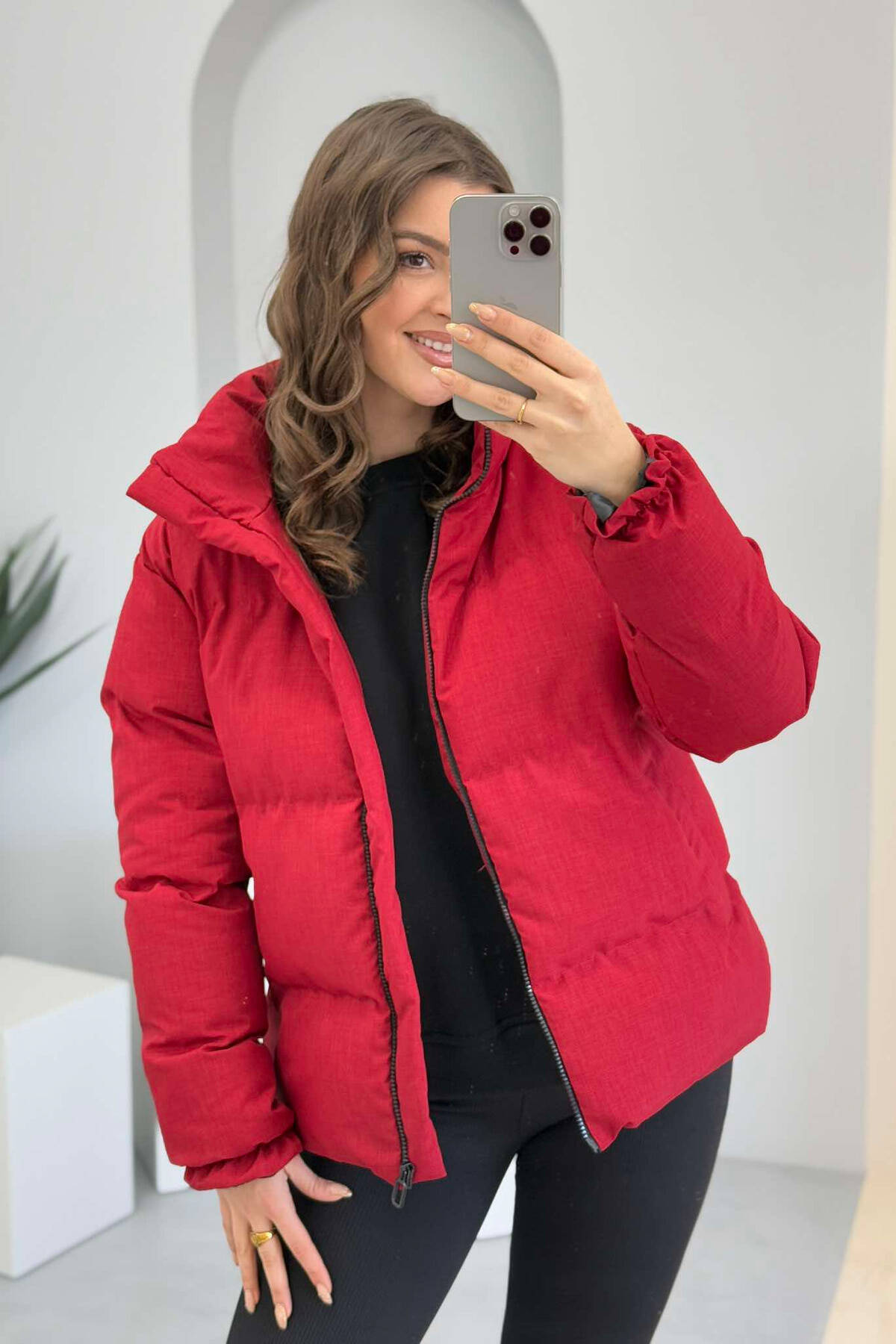 HIGH NECK WOMEN PUFFER JACKET IN BURGUNDY COLOR