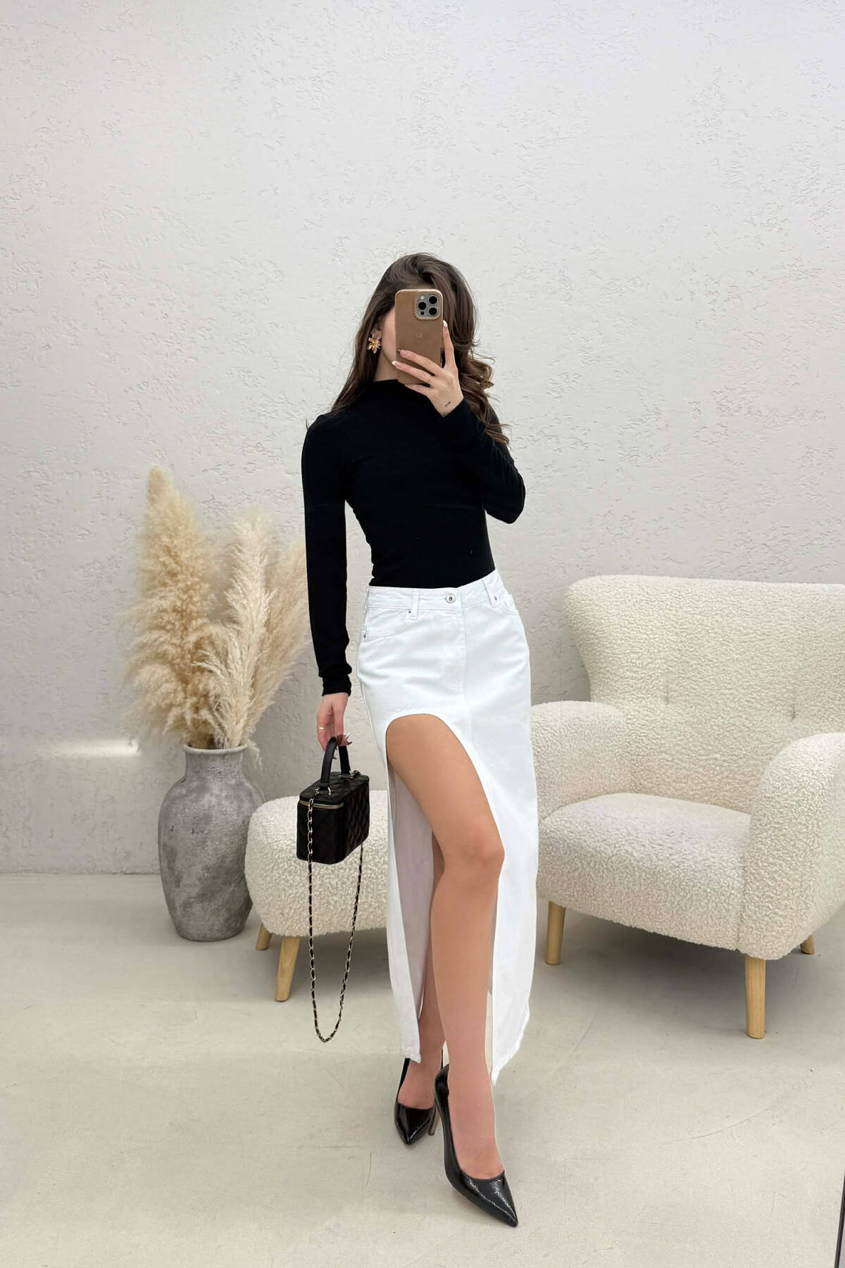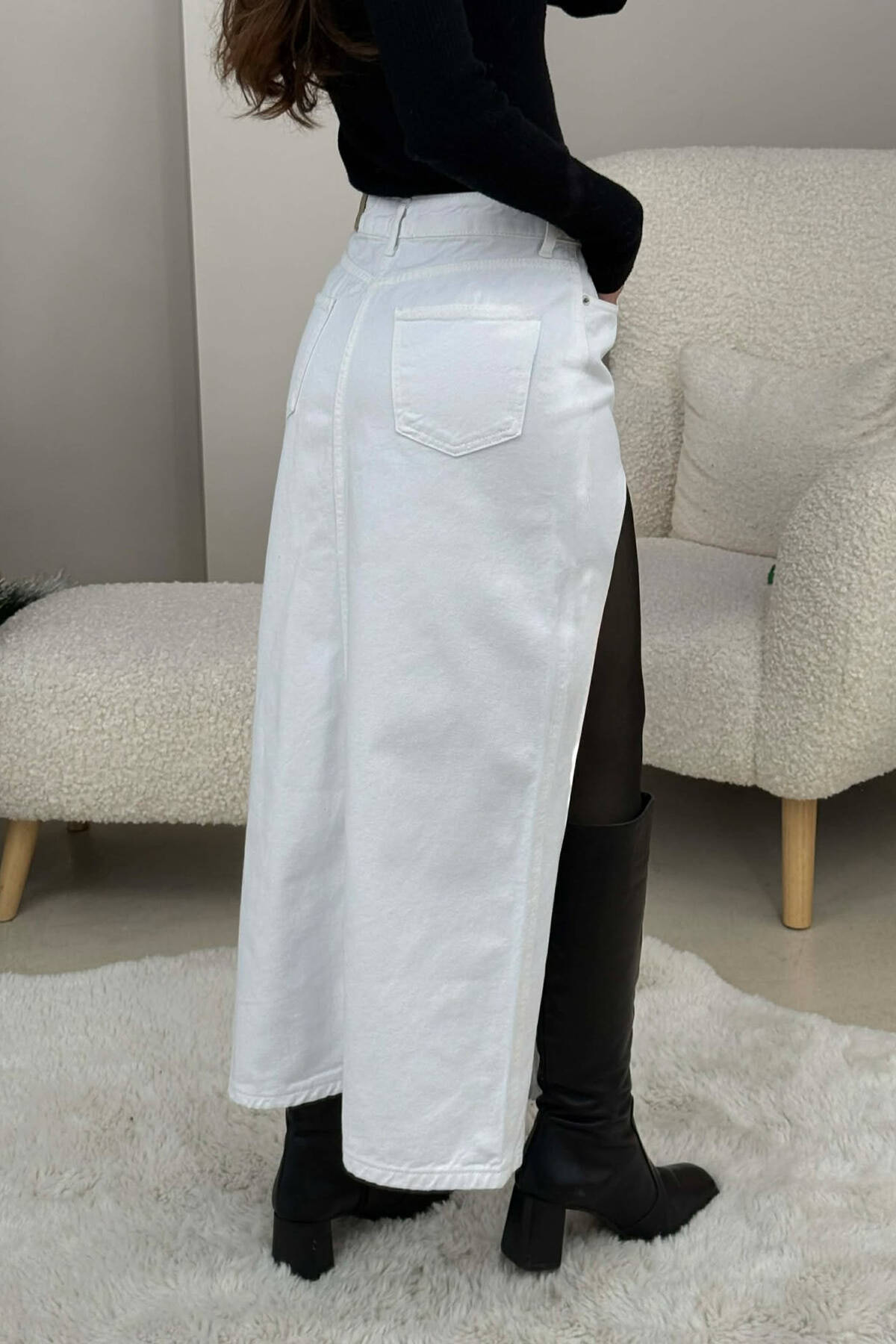 HIGH SPLIT LONG DENIM WOMEN SKIRT WHITE-E BARDHE