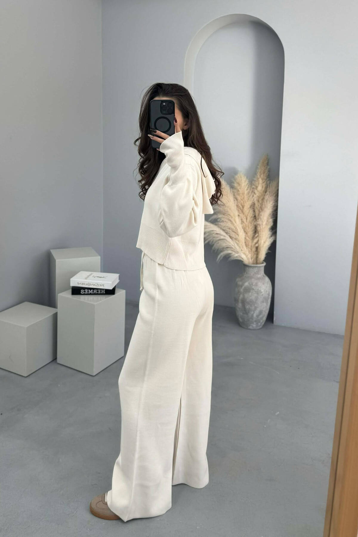 HOODED JACKET+TROUSERS KNIT WOMEN SET CREAM/KREM