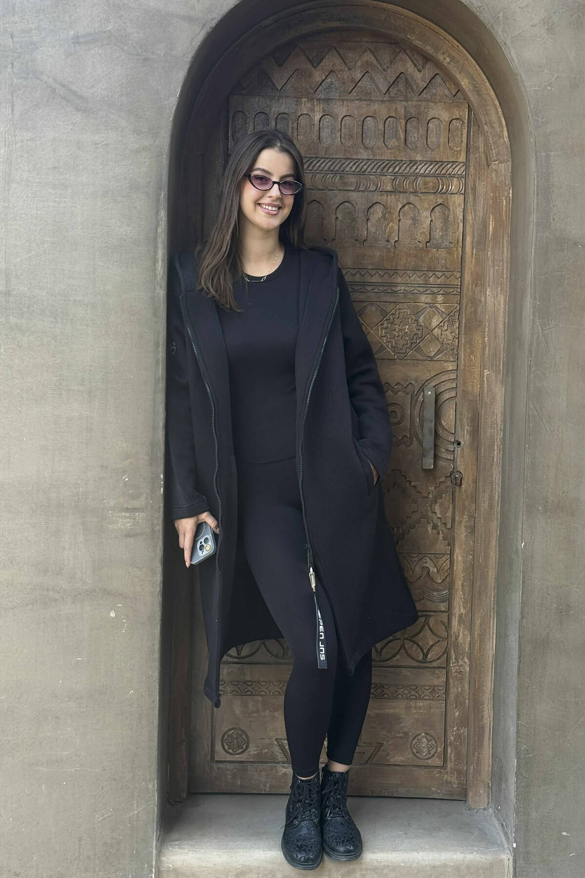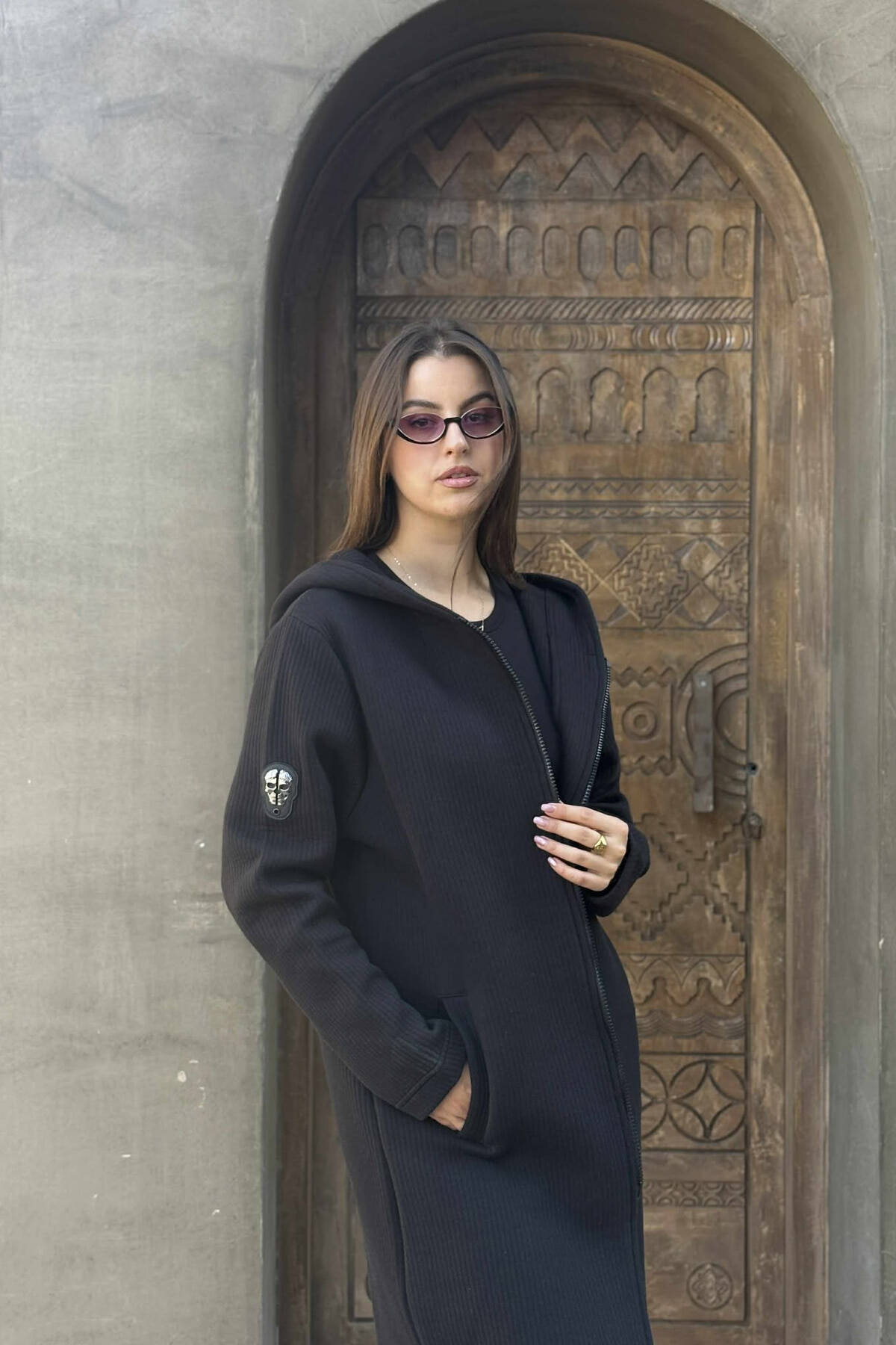 HOODED ONE COLOR LONG WOMEN CARDIGAN BLACK/ E ZEZE