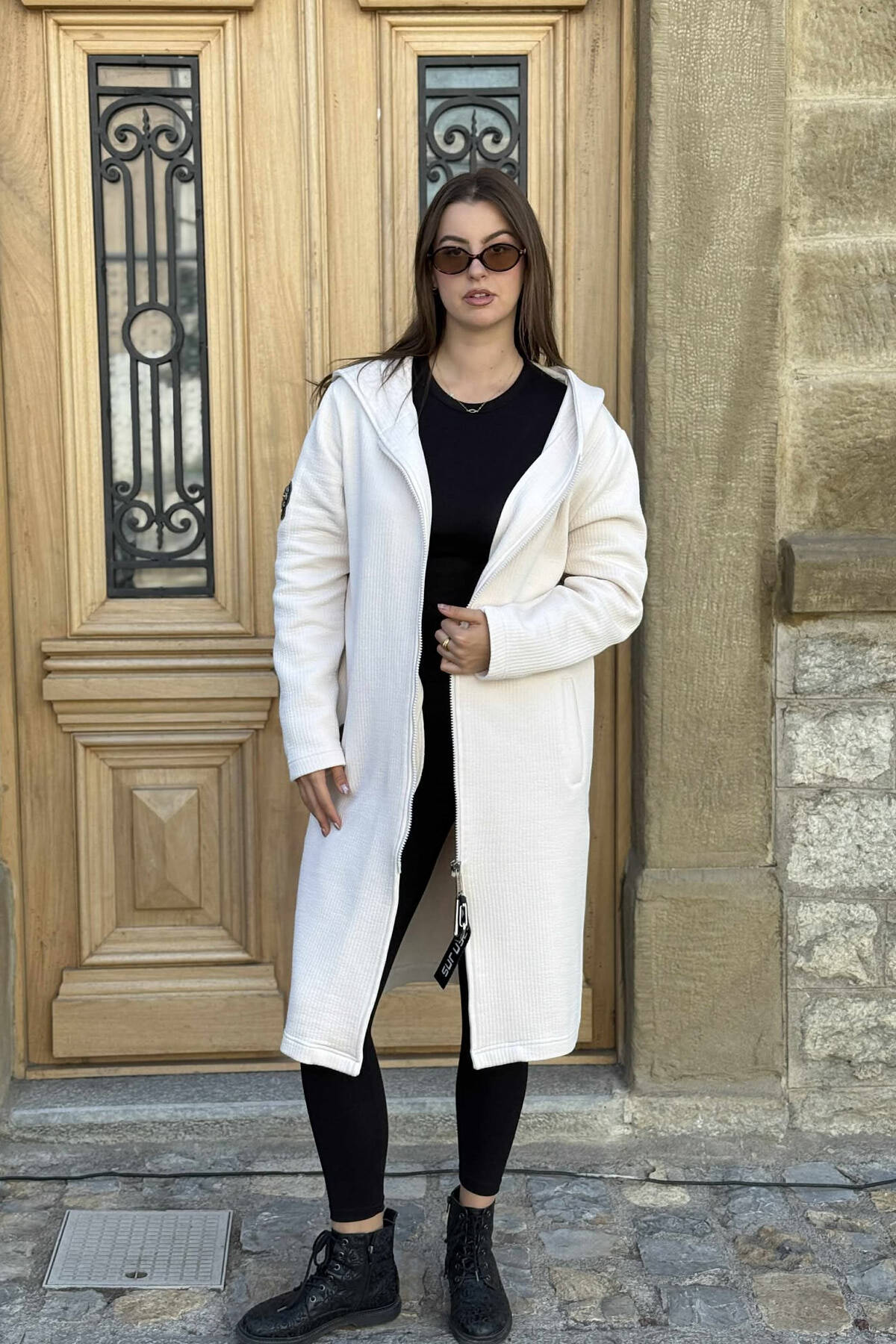 HOODED ONE COLOR LONG WOMEN CARDIGAN CREAM/KREM