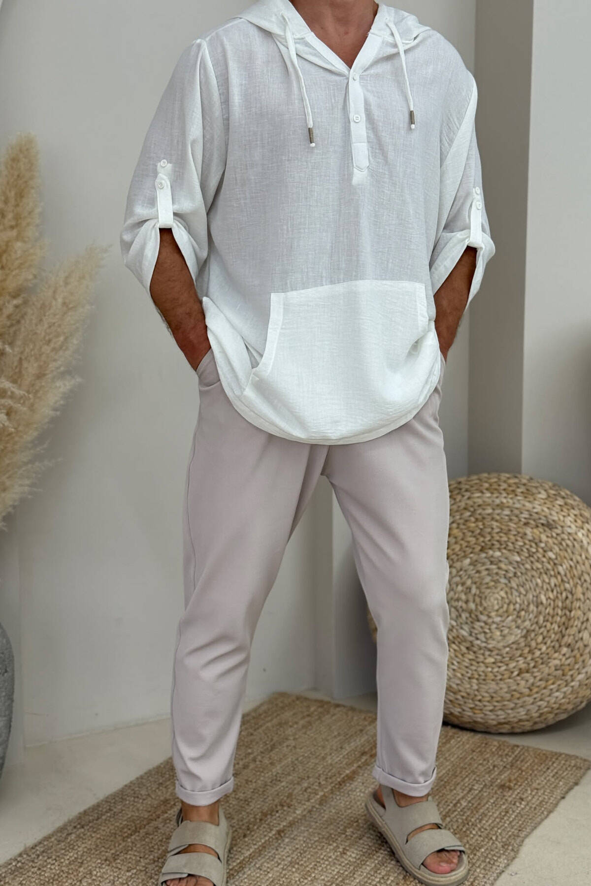 HOODED ONE COLOR MEN T-SHIRT WHITE-E BARDHE