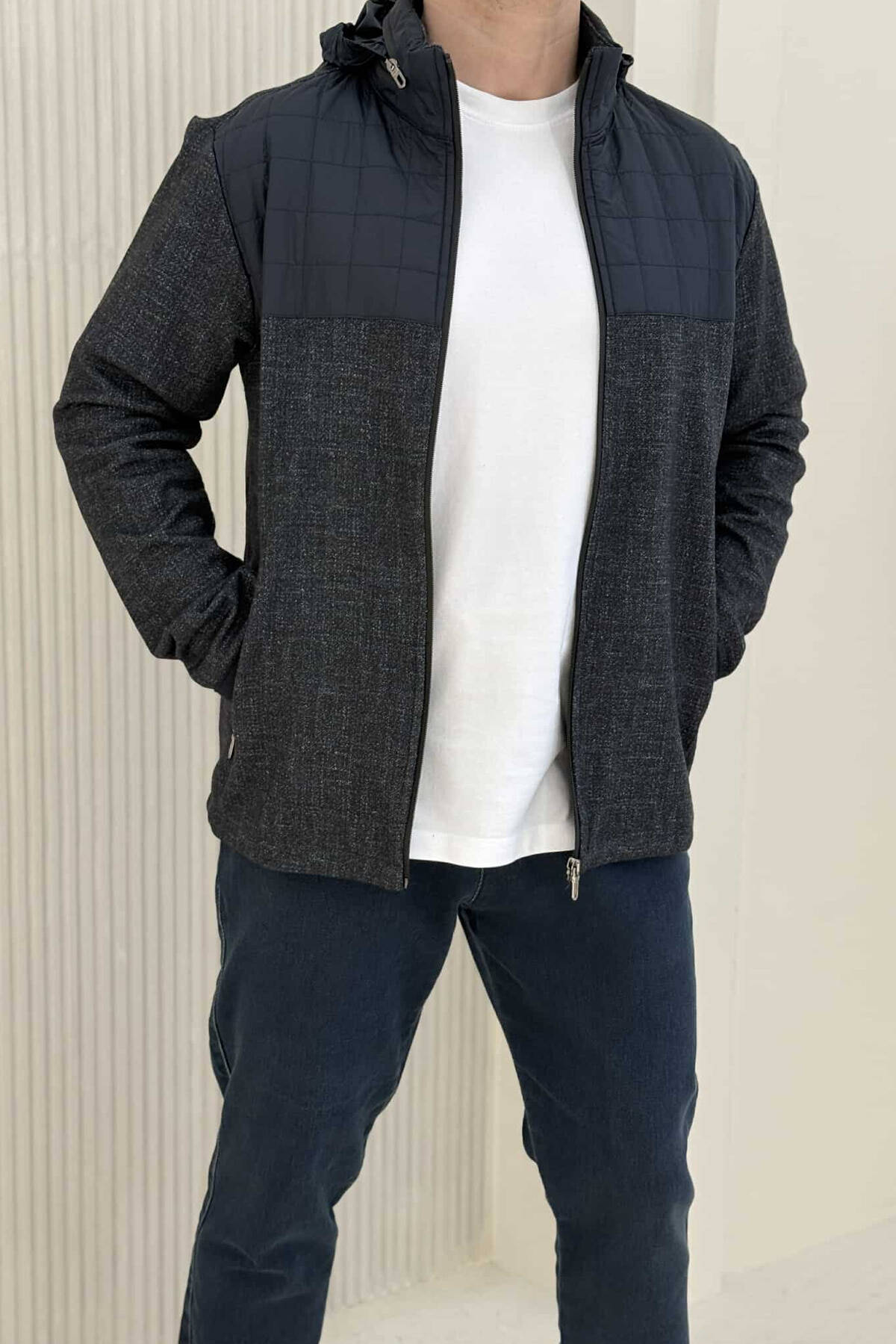 XHAKETË ME KAPUC PËR MESHKUJ NË NGJYRËN BLU E ERRËT