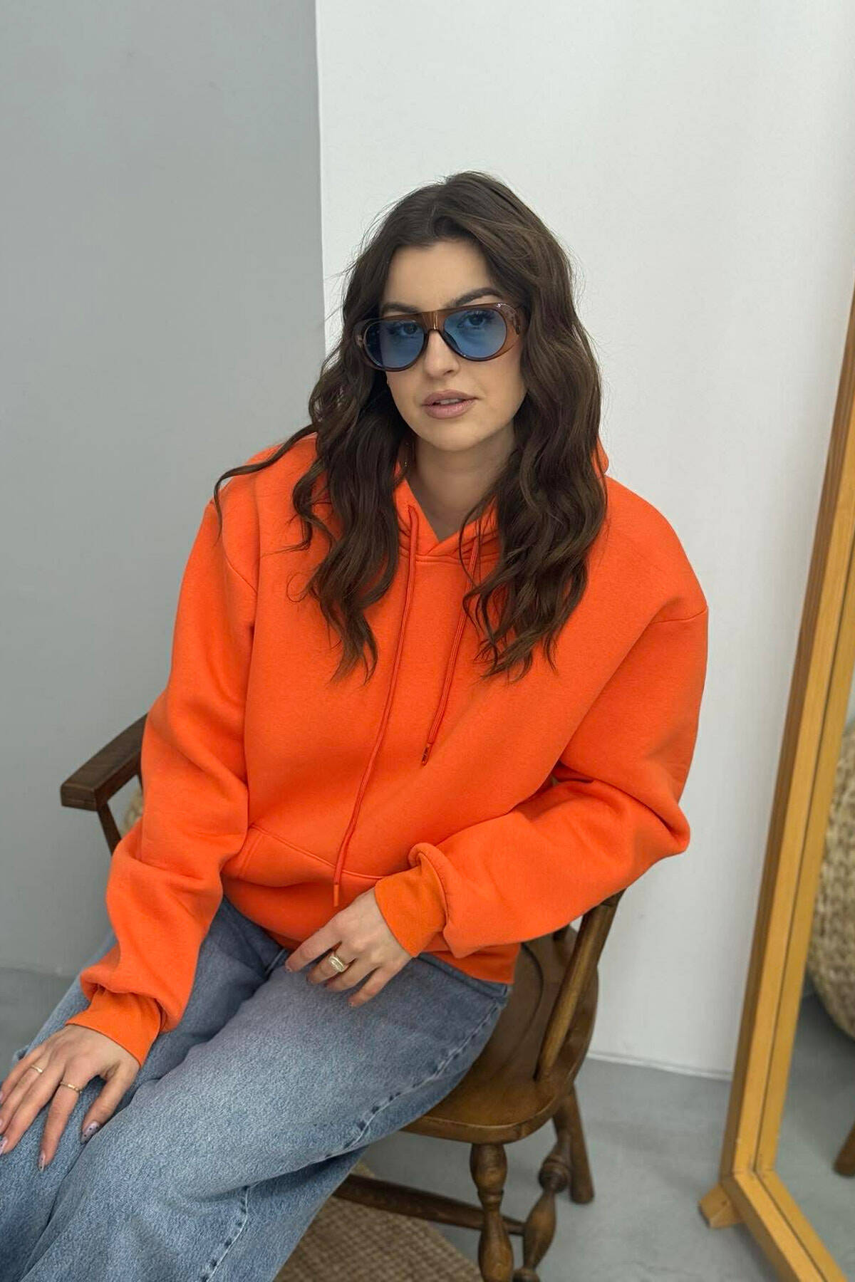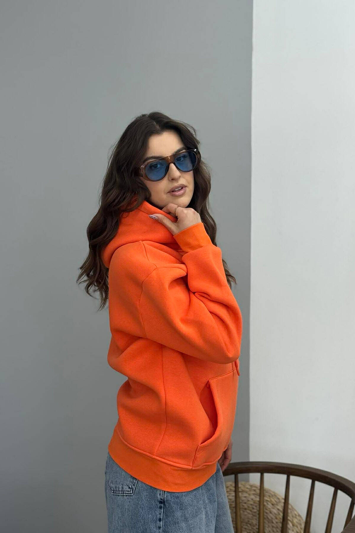 HOODIE E THJESHTE NJË NGJYRESHE ME PUSH PER FEMRA NË NGJYRE PORTOKALLI